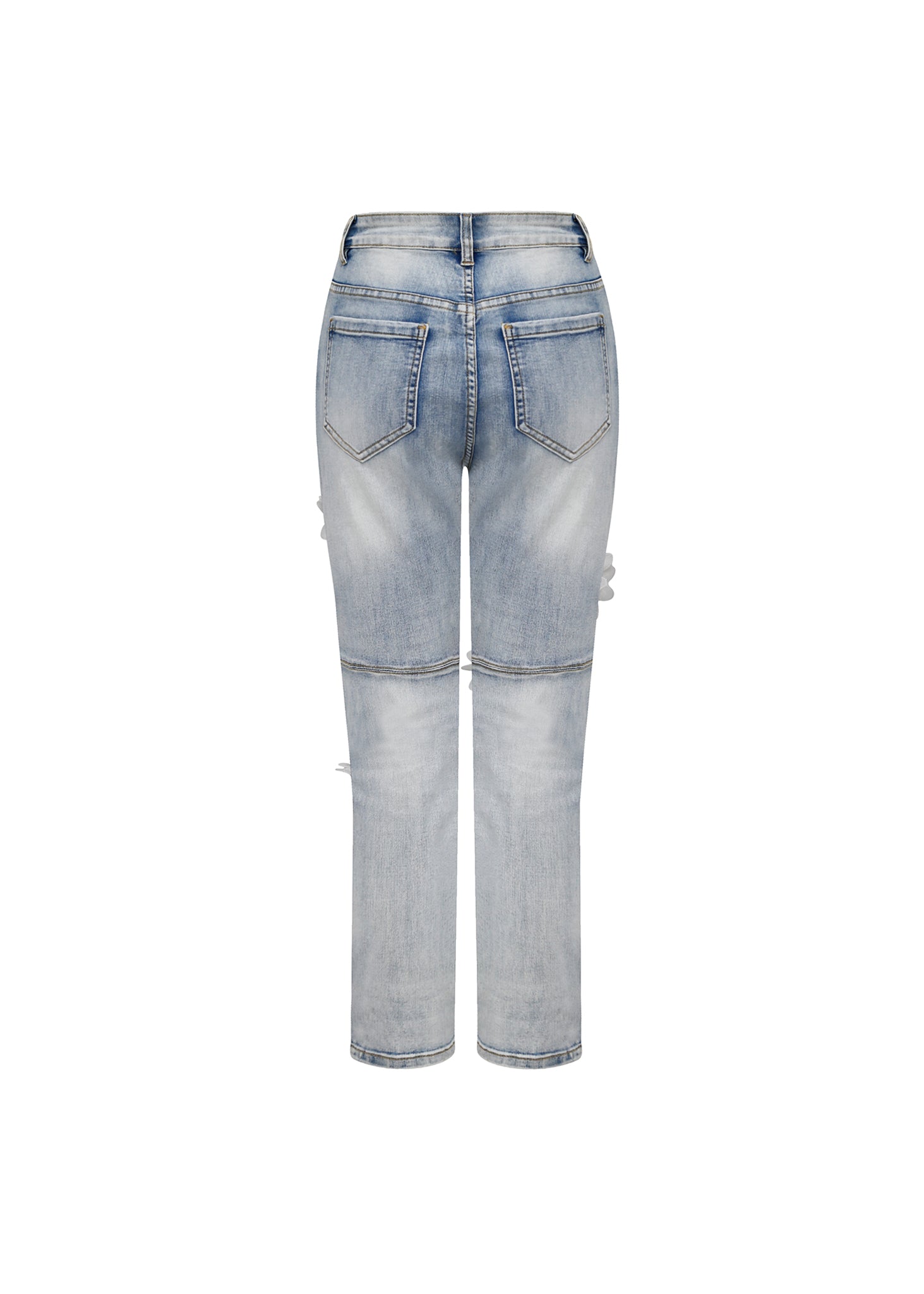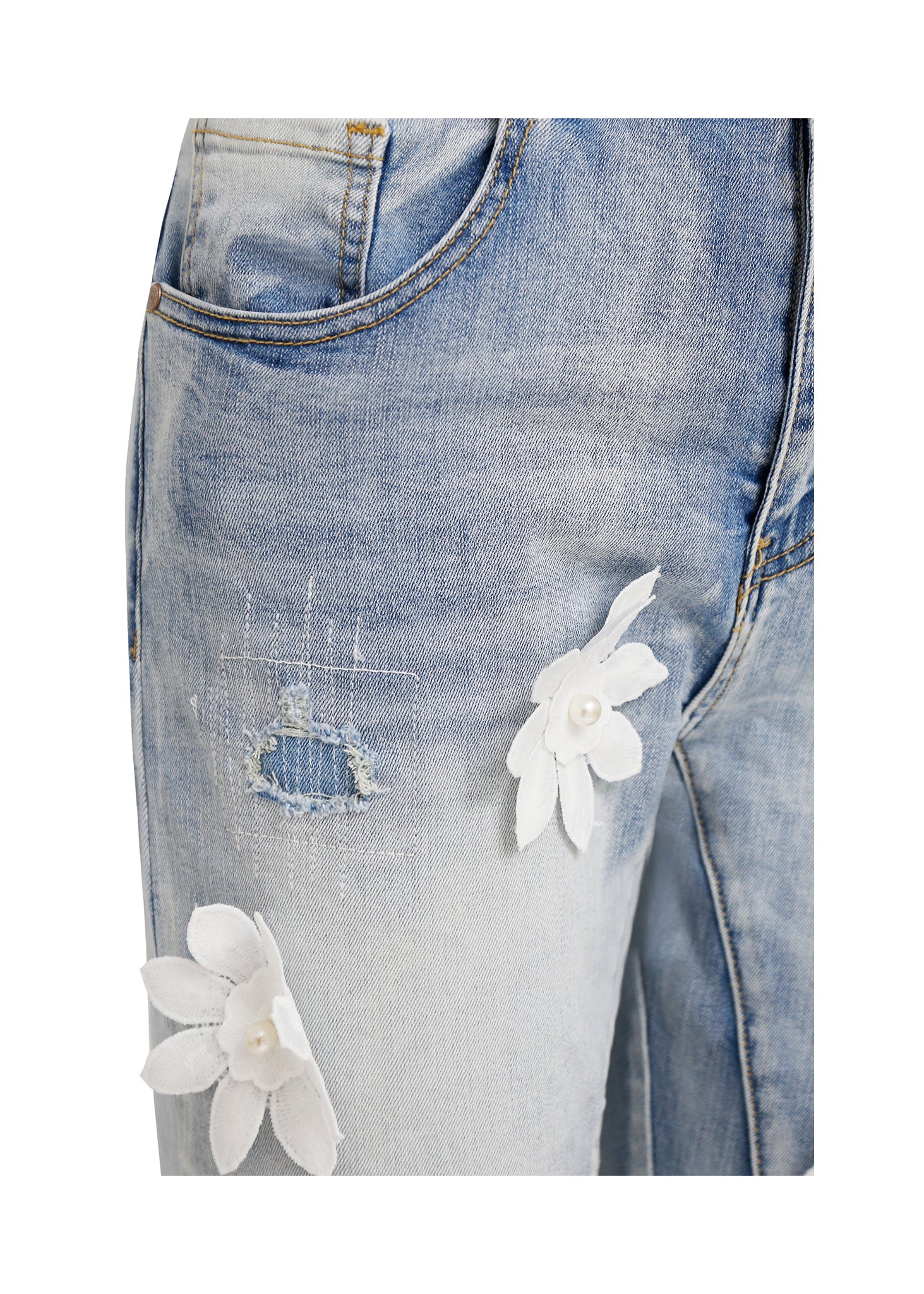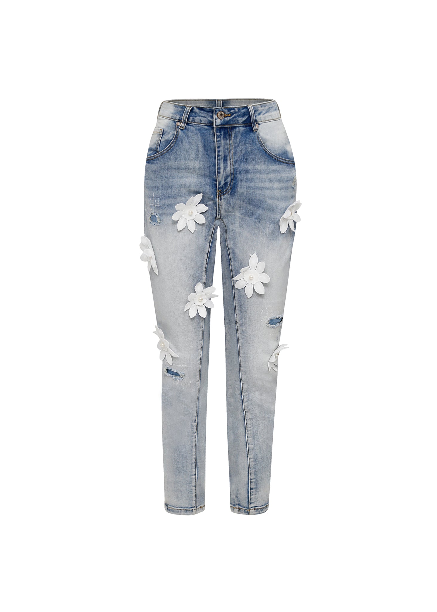 Los jeans Floral Bloom destacan por su base en un lavado azul claro con efectos de desgaste localizado, proporcionando una estética vintage y vivida.