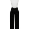 Líneas limpias para una elegancia sin esfuerzo. Este jumpsuit de diseño contemporáneo combina un top blanco impecable de cuello redondo y silueta sin mangas con un pantalón negro de sastre de tiro alto. Su estructura equilibrada y el detalle del cinturón delgado crean una figura estilizada y profesional, ideal para la mujer moderna.