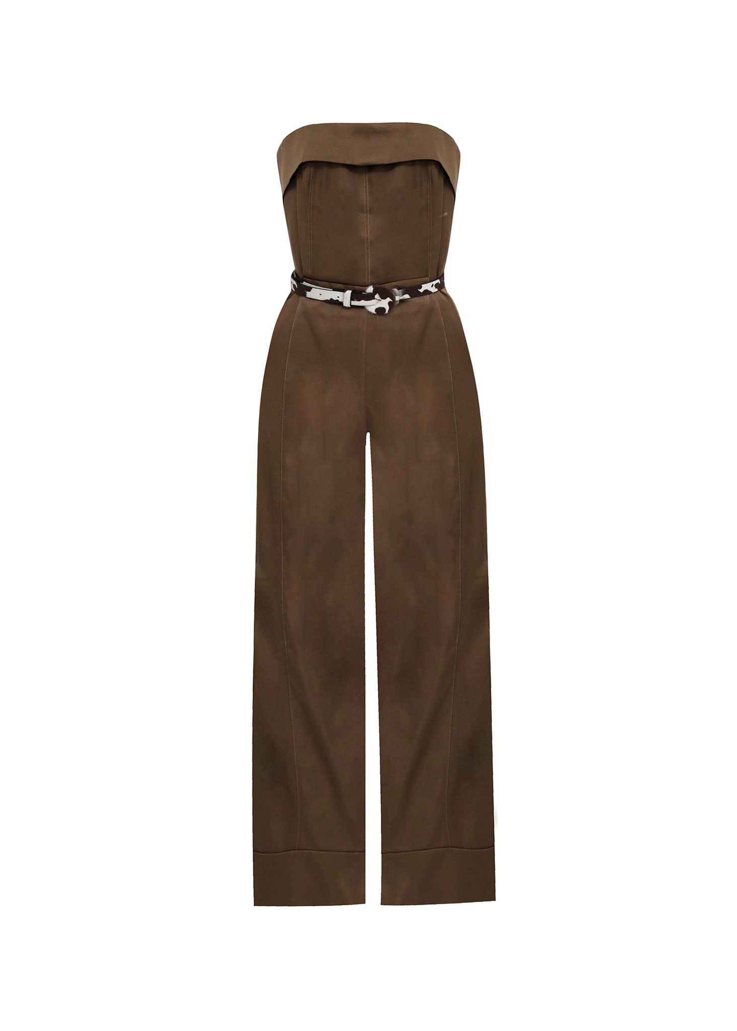Este enterizo largo de silueta "strapless" en color café moka es una pieza de diseño minimalista y arquitectónico que destila una sofisticación moderna. La prenda destaca por su escote recto con una solapa estructurada, que aporta una línea limpia y elegante a la parte superior del torso.