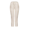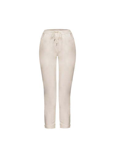 Este pantalón en un sofisticado tono marfil combina la estética pulida de la sastrería con la funcionalidad de las prendas deportivas de lujo. La pieza destaca por su diseño de tiro alto que integra una cintura elástica fruncida y un cordón de ajuste tonal con herrajes metálicos, permitiendo una adaptación perfecta y cómoda a la silueta. Presenta un corte slim fit que se desliza suavemente por la pierna, rematando en un bajo con vuelta (cuff) que aporta un aire casual y dinámico. Confeccionado en un tejido de textura ligera y caída impecable, el diseño incluye prácticos bolsillos laterales de corte curvo que refuerzan su versatilidad. Es la prenda ideal para elevar estilismos de diario con una nota de frescura y minimalismo contemporáneo.