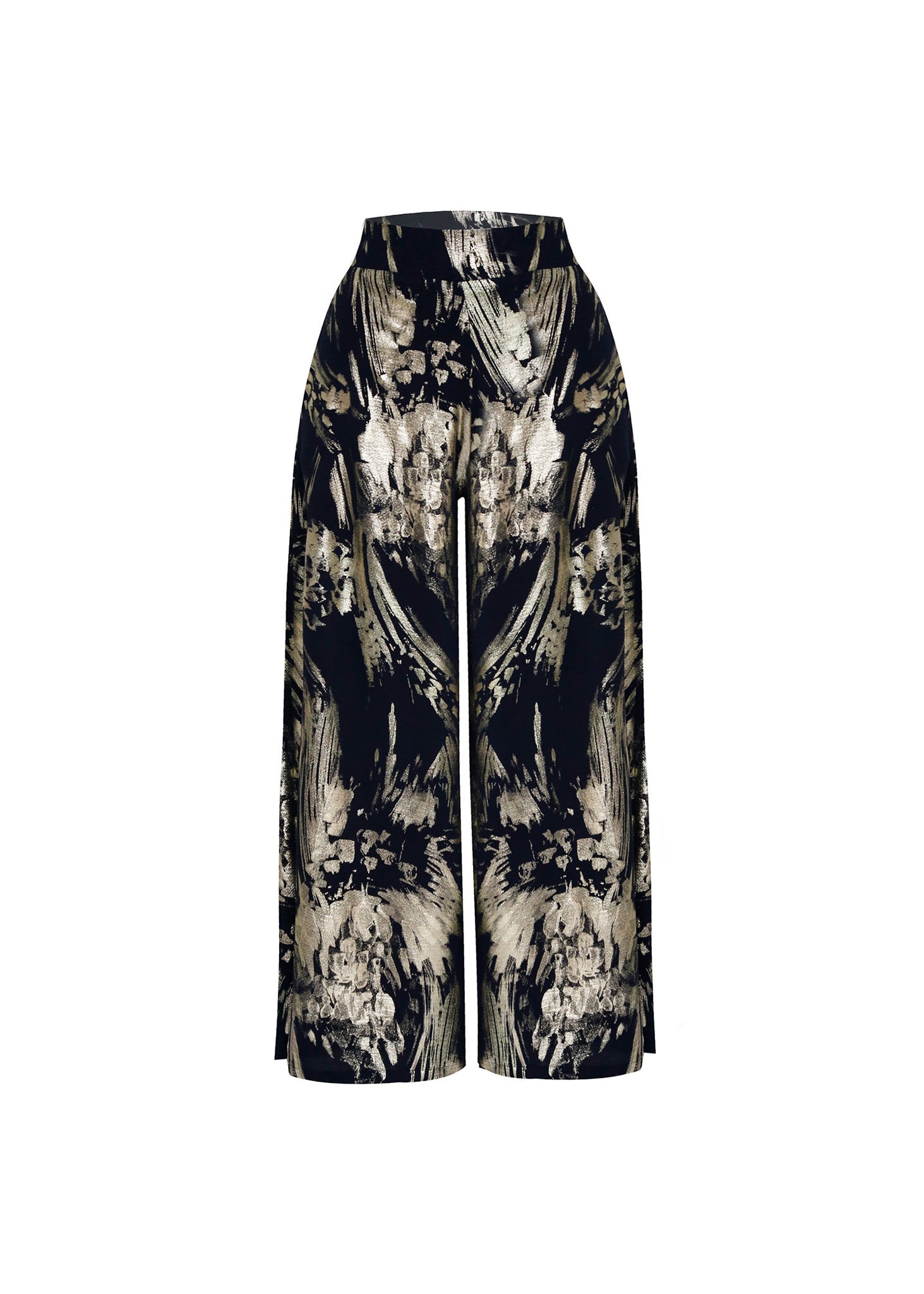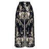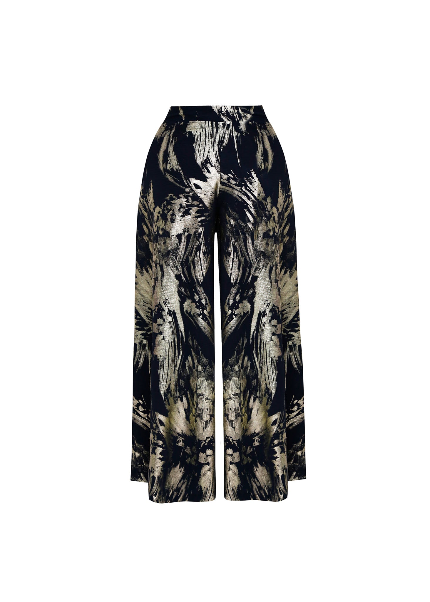 Lujo en cada movimiento. Este pantalón tipo palazzo redefine la elegancia nocturna con un espectacular estampado abstracto en tonos dorados y champaña sobre una base negra profunda. Su diseño de pierna ancha y caída fluida crea un efecto visual imponente, perfecto para eventos de alto perfil.