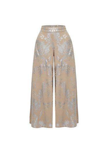 Este sofisticado pantalón de silueta palazzo y tiro alto destaca por su confección en un tejido de caída fluida con un acabado de lujo. La pieza presenta un cautivador motivo botánico de efecto metalizado en tonalidad plata, aplicado mediante una técnica de foil o brocado ligero sobre una base en tono arena neutro. Su diseño de pernera amplia y estructura limpia en la cintura garantiza un movimiento elegante y una estética vanguardista, consolidándose como una prenda declaración (statement piece) ideal para eventos de gala, estilismos de noche o propuestas de etiqueta contemporánea.