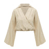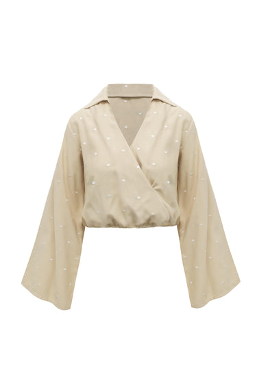 Una silueta que abraza la feminidad desde la fluidez y el equilibrio. La blusa “Nude Eclipse” se distingue por su escote cruzado que estiliza la figura y aporta un aire sofisticado y contemporáneo, mientras su base en tono neutro con delicados puntos bordados crea una textura sutil y elegante. Las mangas amplias generan movimiento y ligereza, contrastando con el ajuste en cintura que define la silueta con precisión. Es una prenda versátil que transita con naturalidad entre lo casual elevado y lo refinado, pensada para la mujer Scarsa que proyecta seguridad a través de la sencillez bien construida.