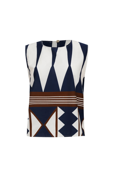 Una pieza que equilibra arte gráfico y sofisticación contemporánea. La blusa “Tribal Navy Essence” destaca por su estampado geométrico de inspiración étnica, donde el azul profundo se fusiona con contrastes en marfil y acentos tierra, evocando una estética moderna con raíces culturales. Su silueta limpia y sin mangas aporta frescura y versatilidad, mientras el diseño estructurado estiliza la figura con elegancia natural. Es una prenda pensada para la mujer Scarsa que busca diferenciarse con piezas auténticas, fáciles de llevar del día a la noche, manteniendo siempre un aire sofisticado y con carácter.