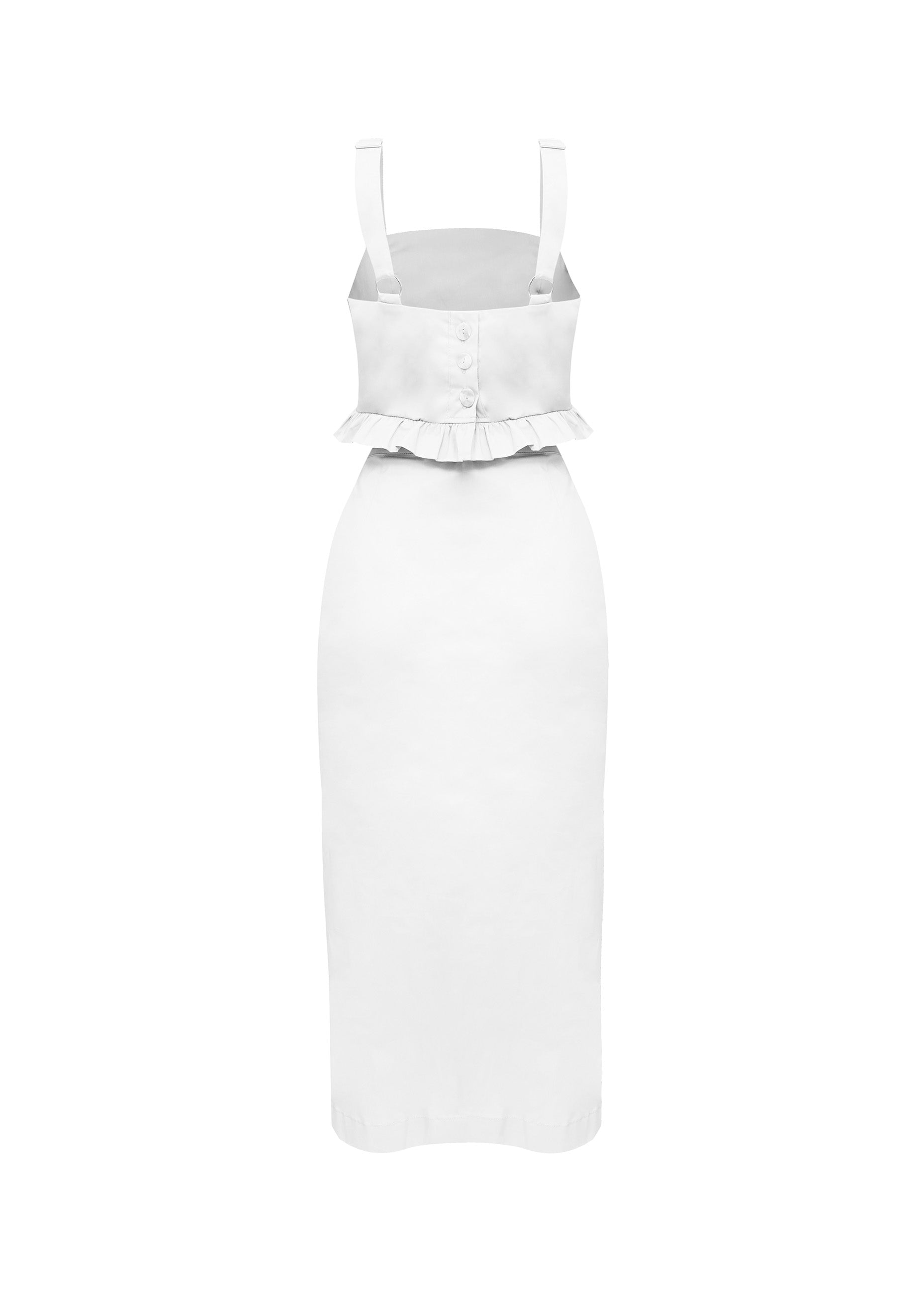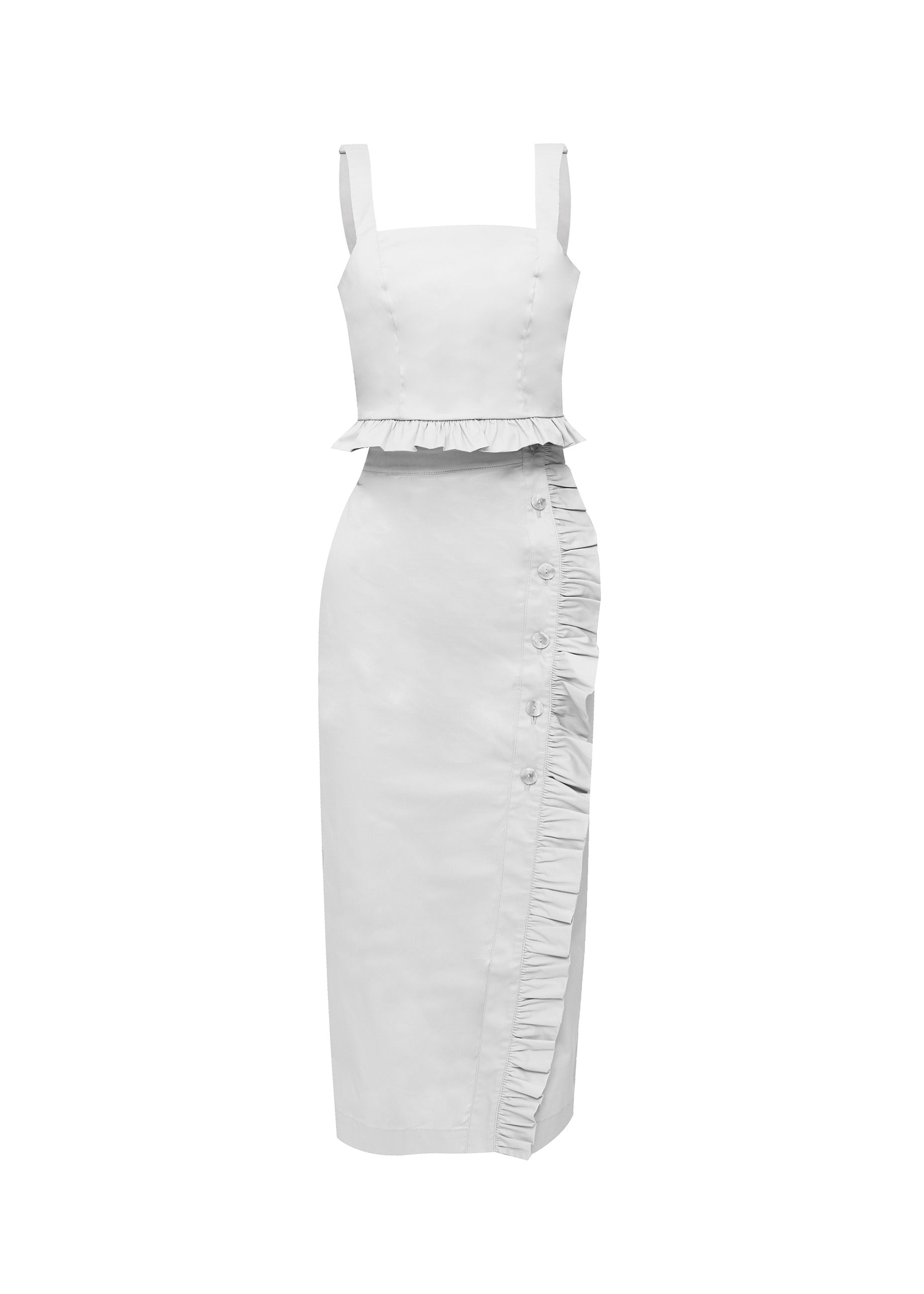 Conjunto en color verde con detalles de fruncidos, confeccionado en algodón compuesto con textura suave y ligera. El top de tirantes presenta un delicado volante en la cintura que realza la silueta, mientras que la falda midi incluye botones decorativos y fruncido lateral que aporta movimiento y un aire sofisticado. Ideal para ocasiones especiales o para un look femenino y moderno.