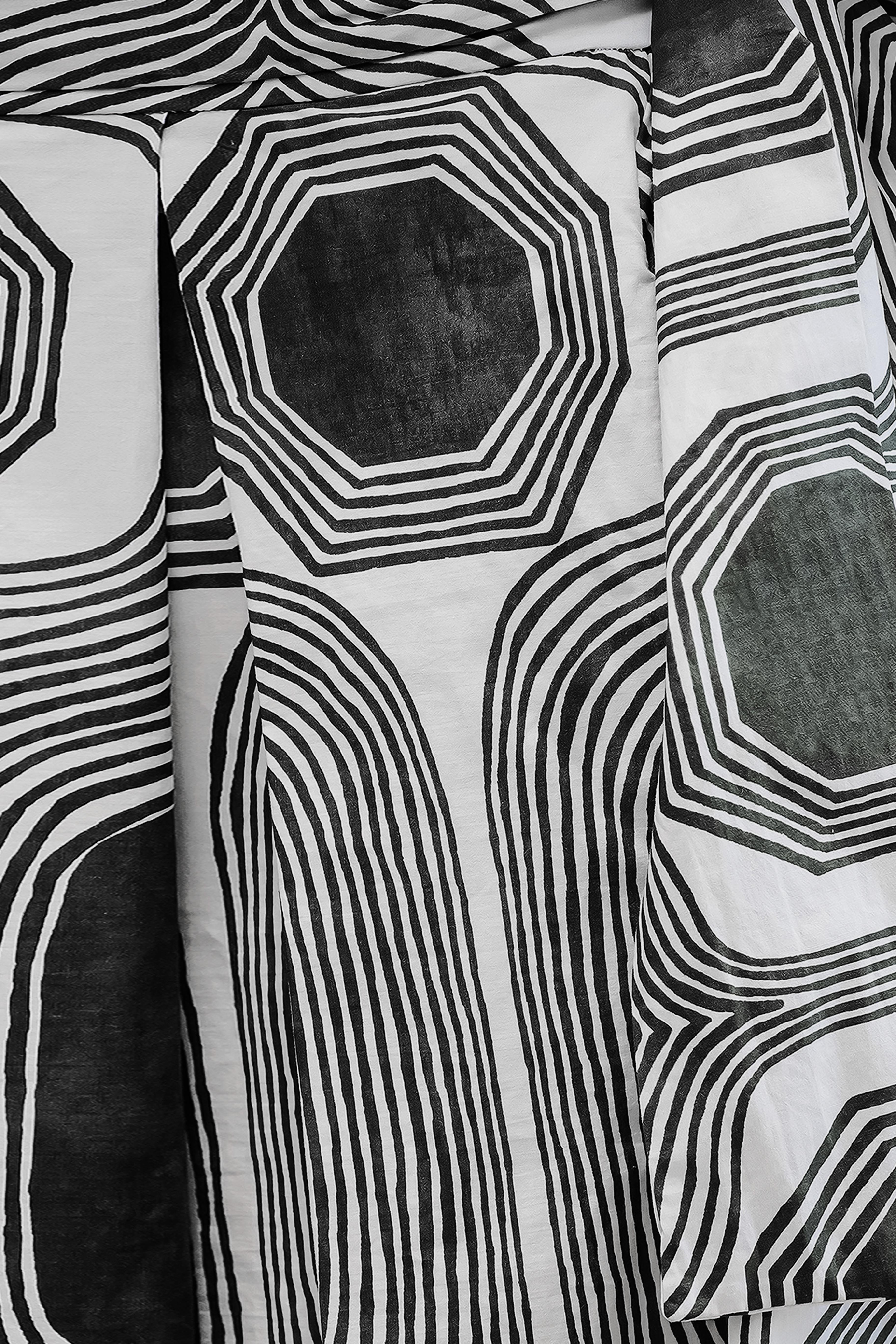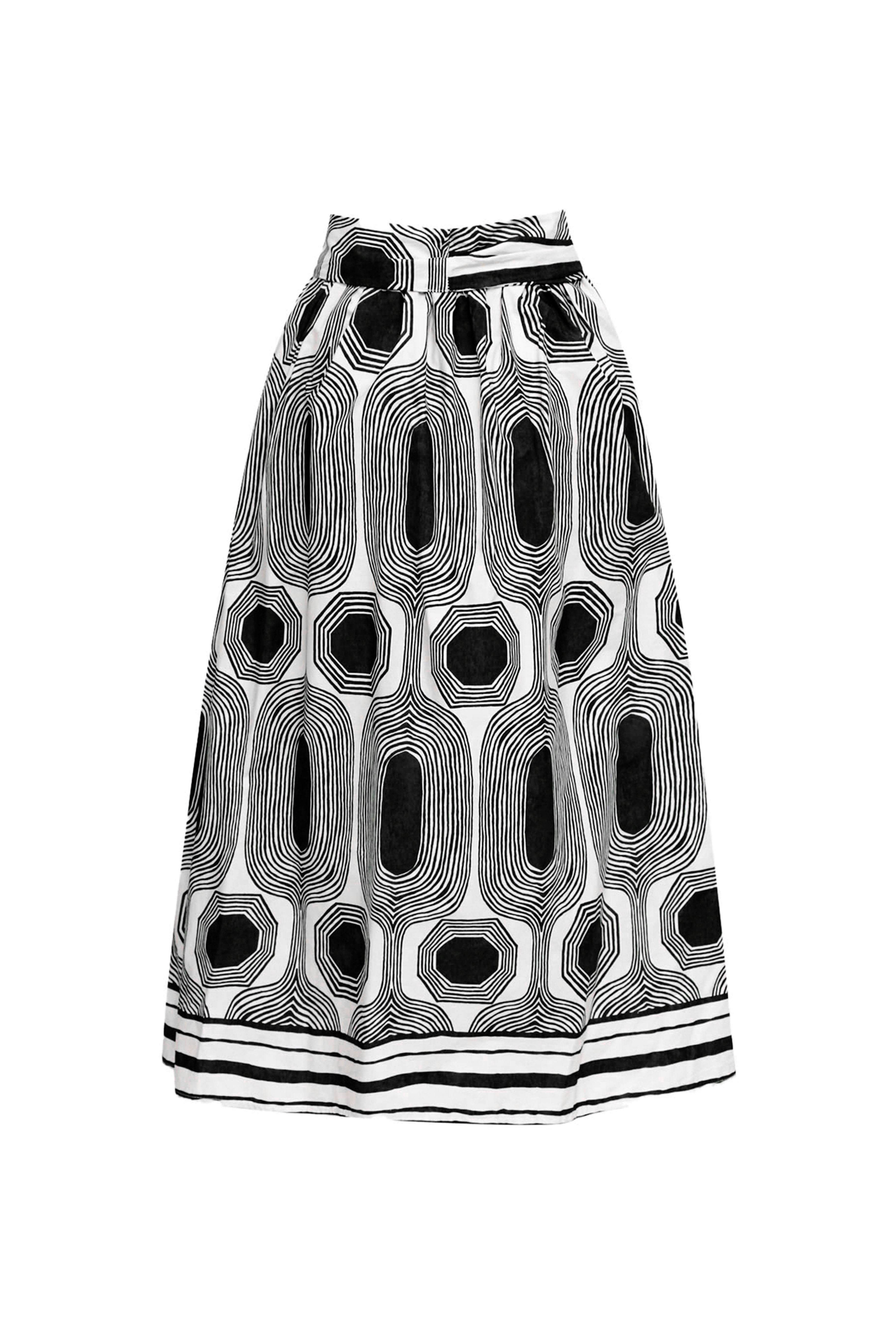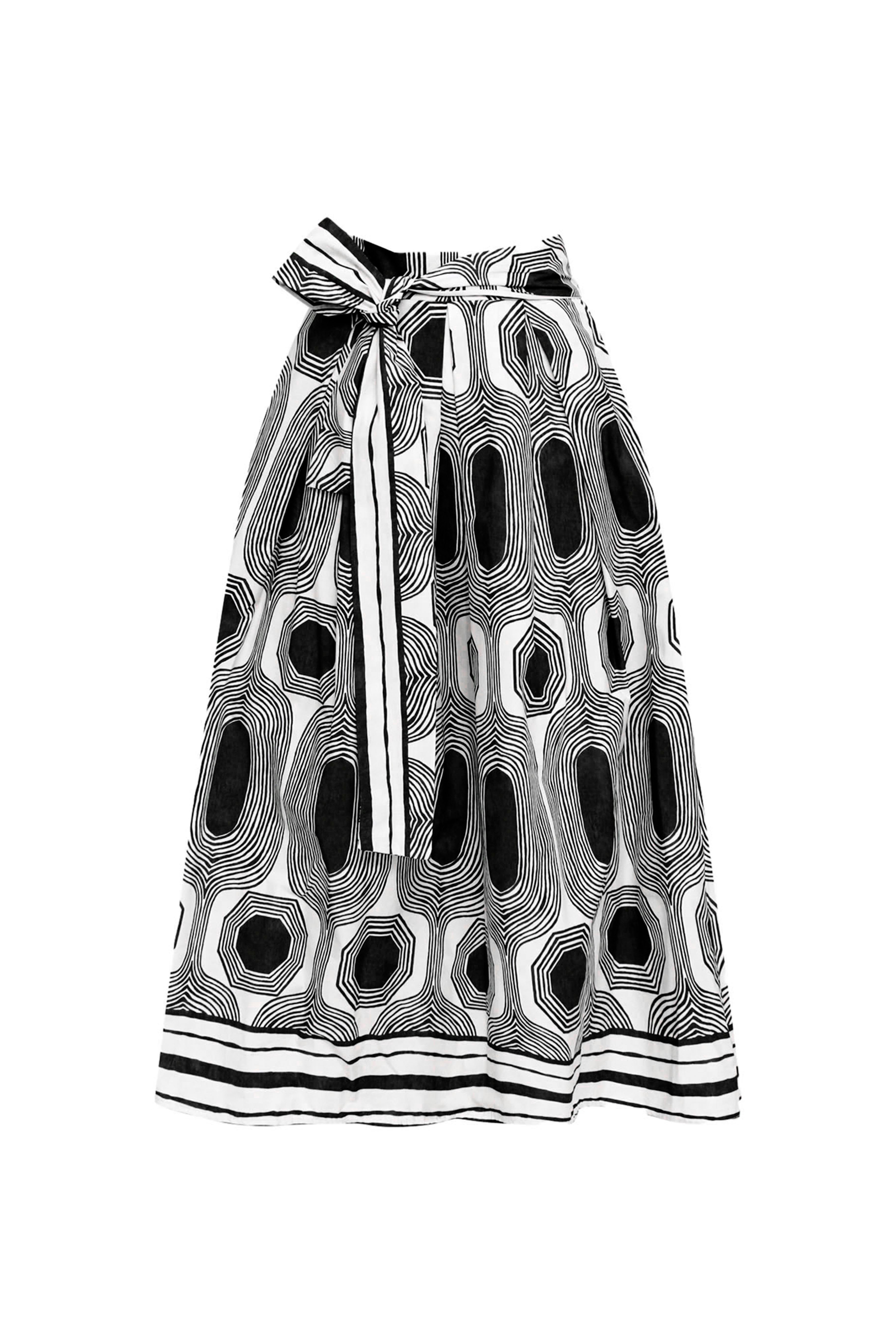 Esta falda larga y fluida que destaca por su llamativo estampado geométrico, creando un diseño visual de formas concéntricas muy moderno y dinámico. La prenda cuenta con una cintura elástica que asegura un ajuste cómodo para diferentes siluetas, complementada por un lazo largo en la misma tela que se anuda al frente para definir la cintura. Su corte es amplio y ligero, terminando en un ruedo con detalle de franjas horizontales que le dan un acabado elegante, ideal para un look casual sofisticado o un conjunto veraniego con mucha personalidad.