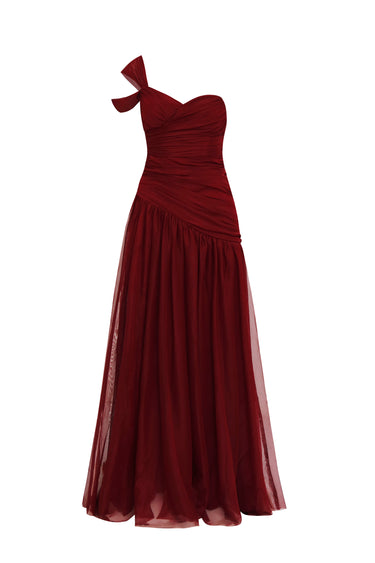 Este imponente vestido de gala en un profundo tono rojo borgoña es una clase magistral de textura y movimiento. El diseño destaca por su escote asimétrico de un solo hombro, adornado con un sofisticado lazo escultural que añade un toque de romanticismo vanguardista. El cuerpo de la prenda presenta un drapeado meticuloso que ciñe la cintura de forma impecable, dando paso a una falda de tul voluminosa y etérea que nace de una costura diagonal, aportando un dinamismo visual inigualable.