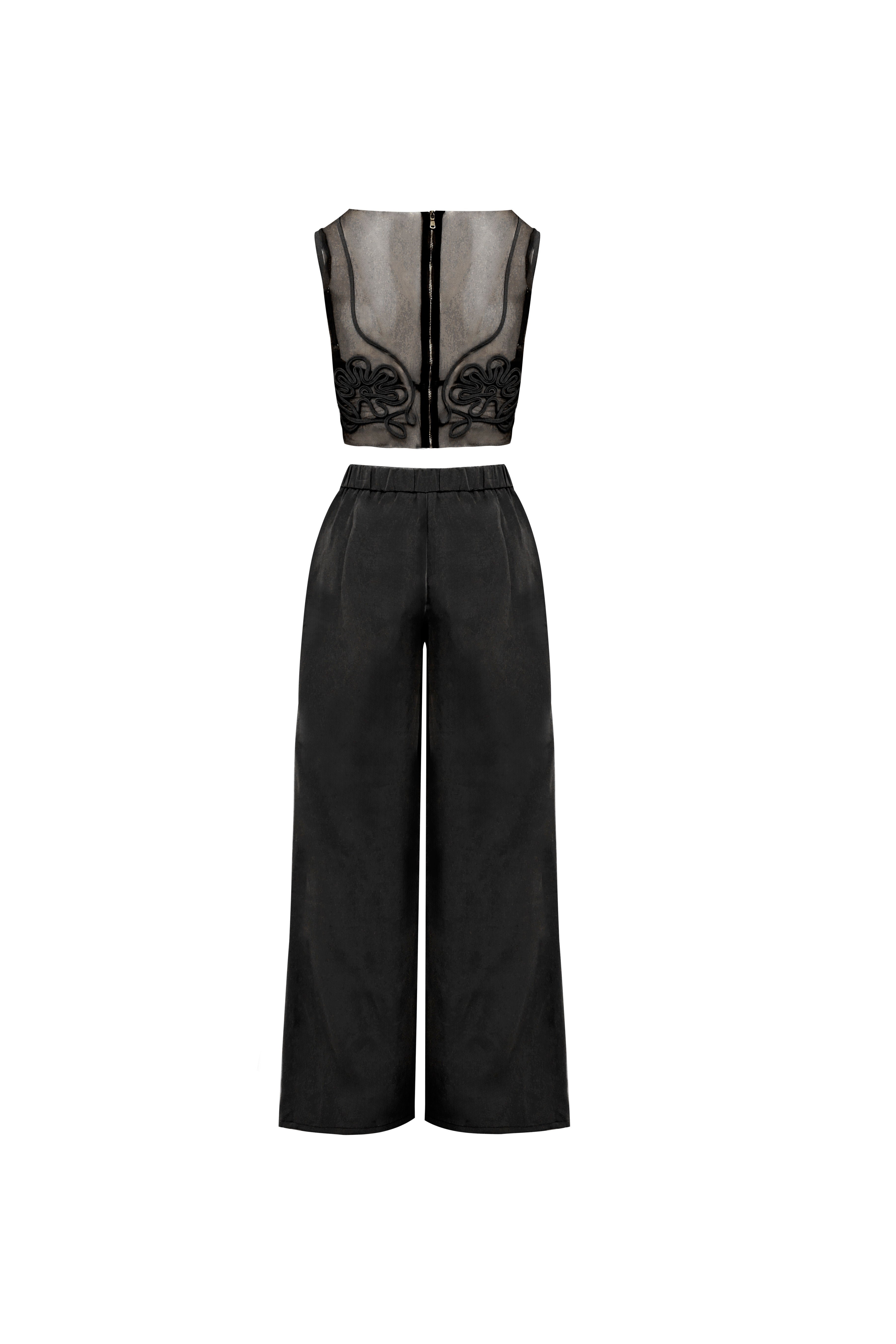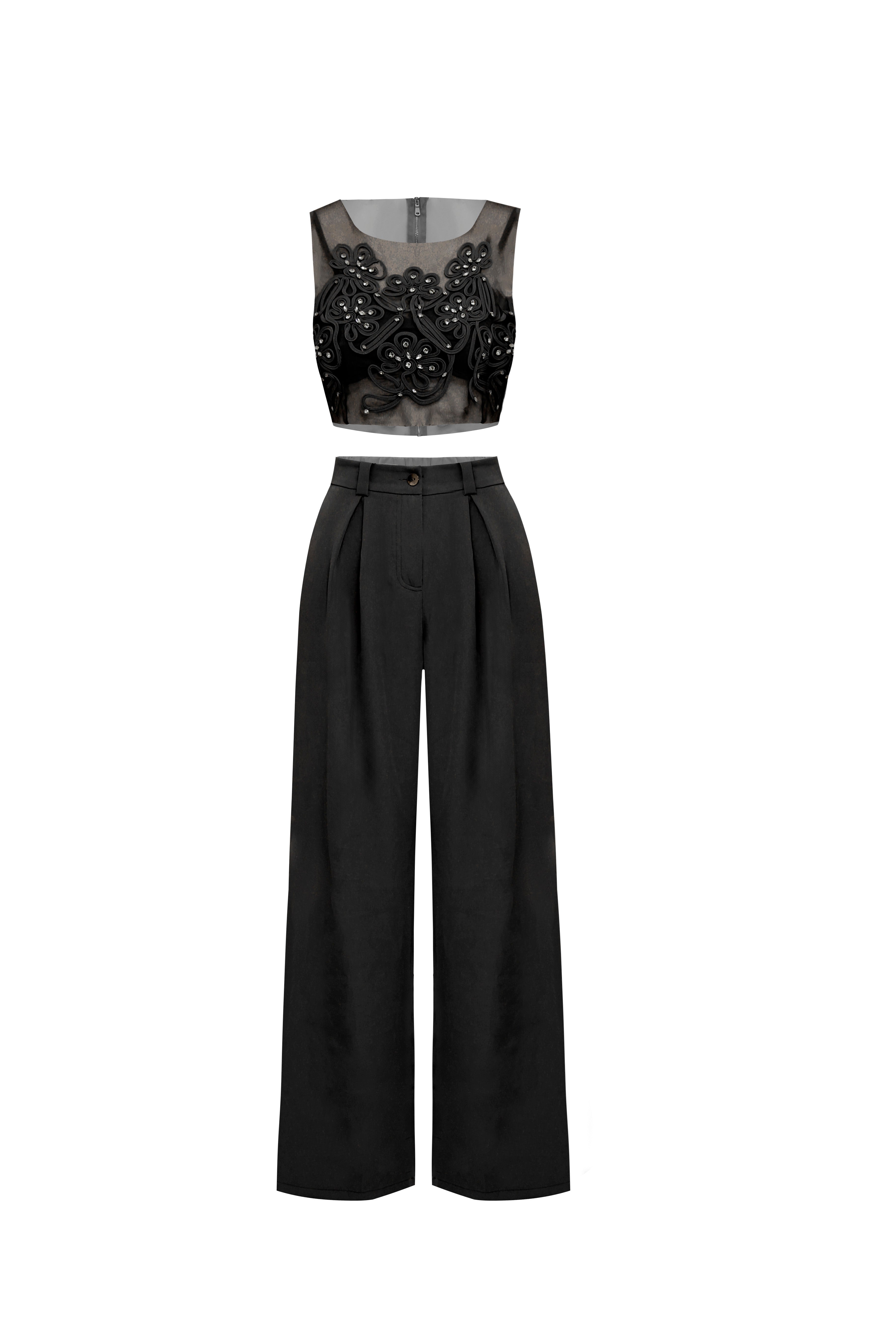 Este impecable conjunto de dos piezas redefine la elegancia nocturna con un equilibrio magistral entre delicadeza y estructura. El top crop destaca por su exquisito panel de tul transparente, adornado con intrincados bordados florales en relieve y detalles de pedrería que capturan la luz de forma sutil. Contrastando con la etérea parte superior, los pantalones de talle alto presentan un corte wide leg de caída impecable, con pinzas frontales que añaden volumen y una sofisticación arquitectónica. Es una apuesta audaz y refinada para la mujer que busca una alternativa moderna al vestido de gala, fusionando la feminidad del encaje con la fuerza de una sastrería impecable.