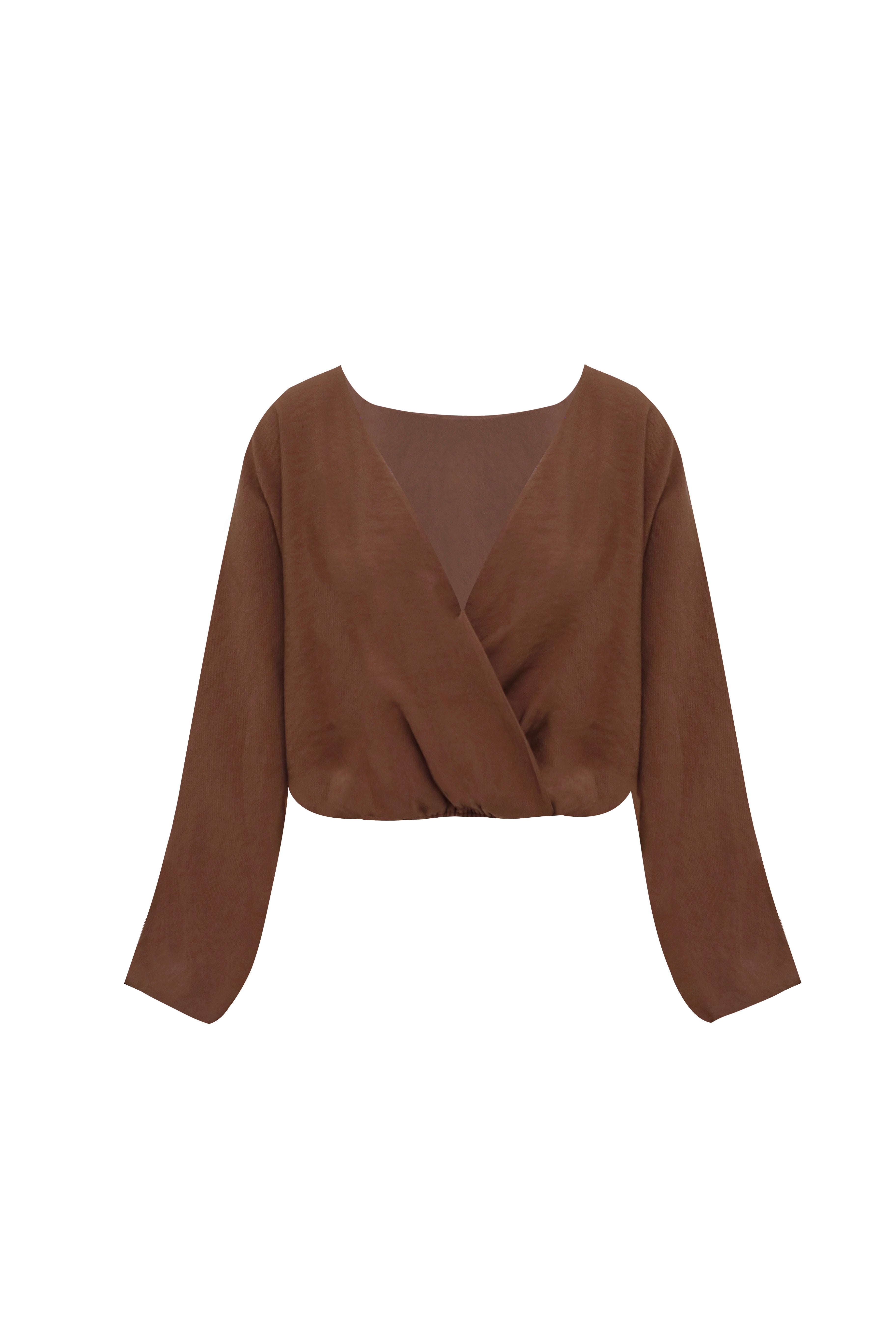 La sofisticación se materializa en la blusa Cropped, una pieza esencial que captura la esencia del lujo contemporáneo a través de su minimalismo refinado. Esta prenda ha sido diseñada con una estructura cruzada tipo wrap que esculpe la silueta, creando un escote en V profundo de una elegancia atemporal.
