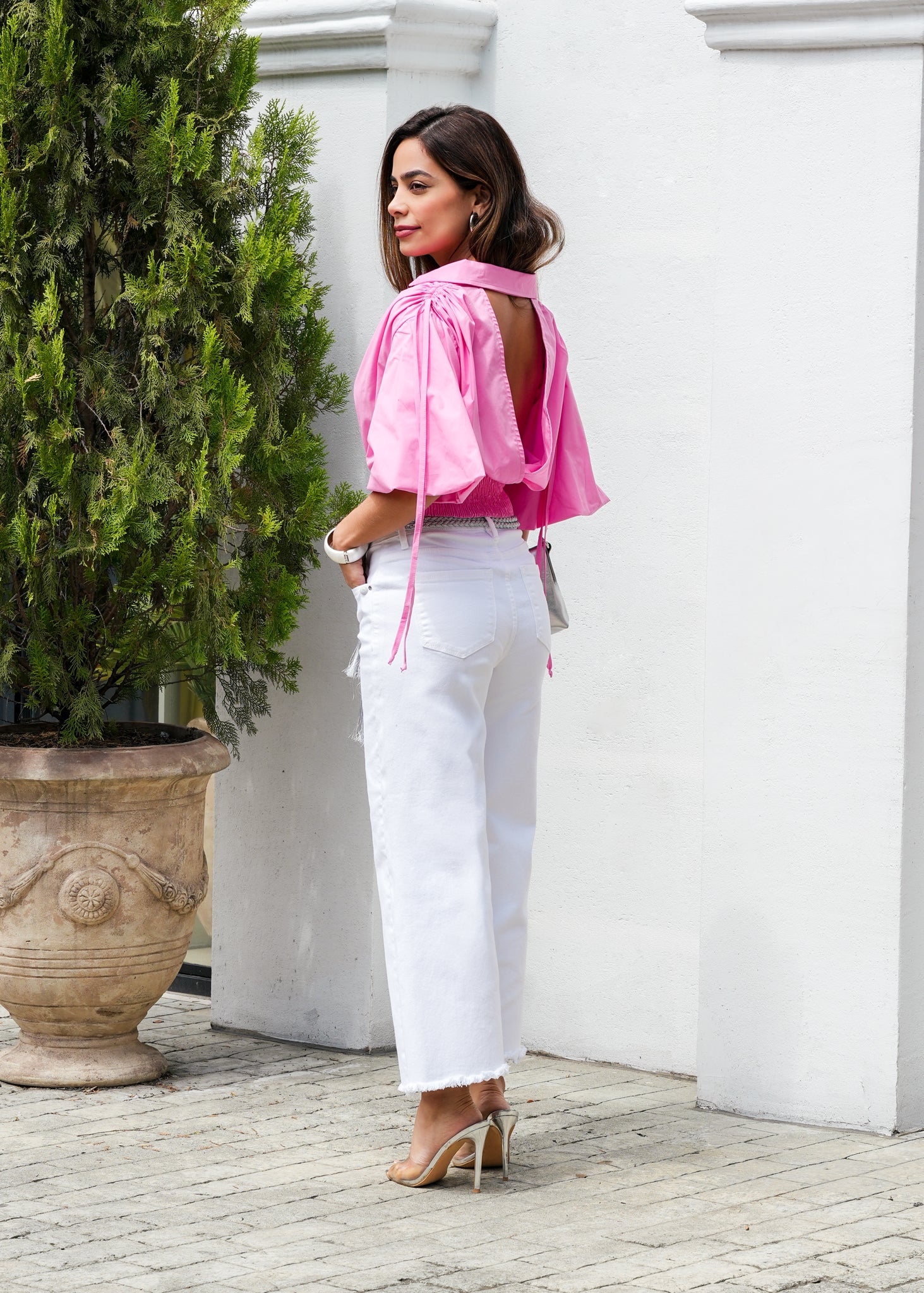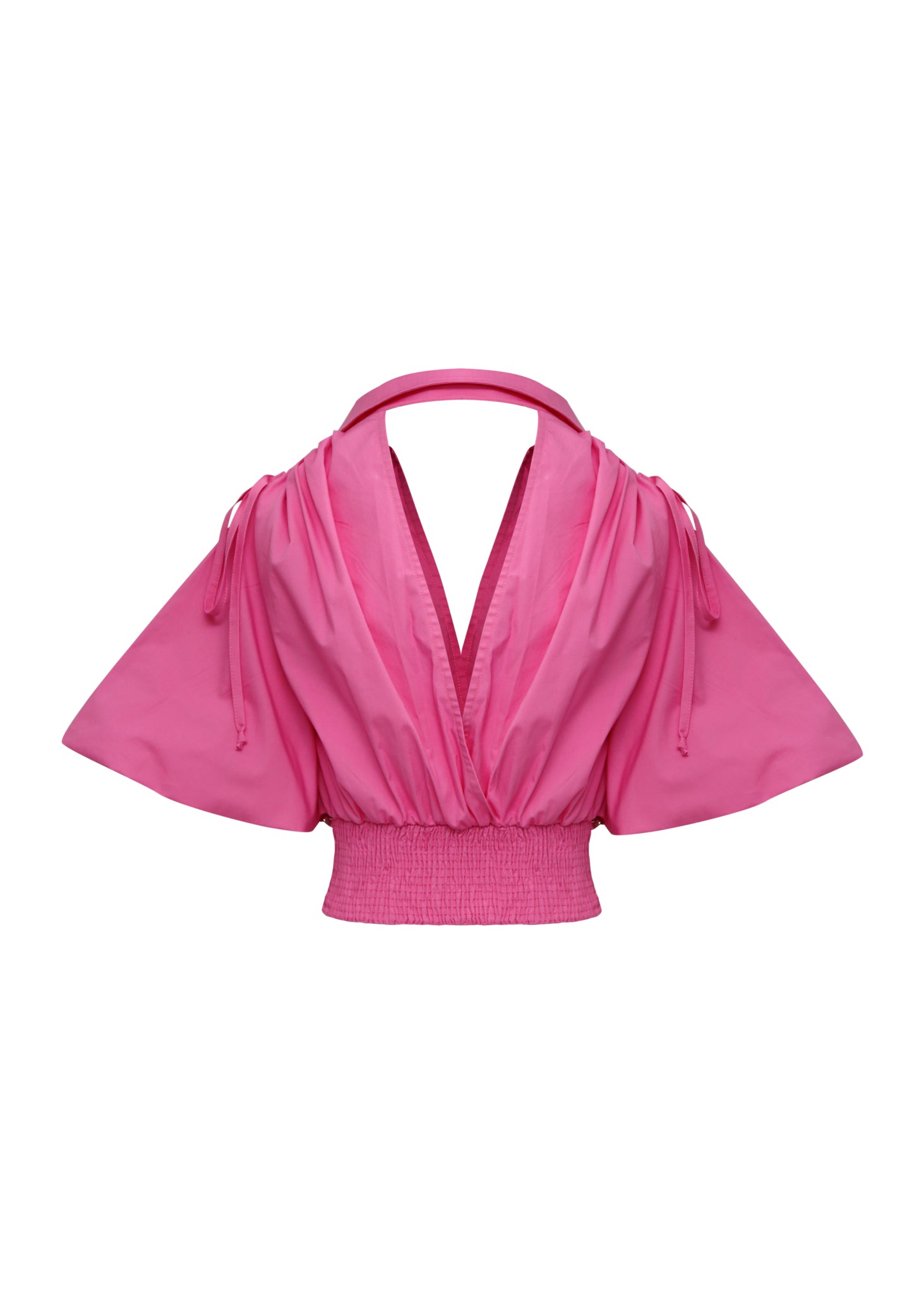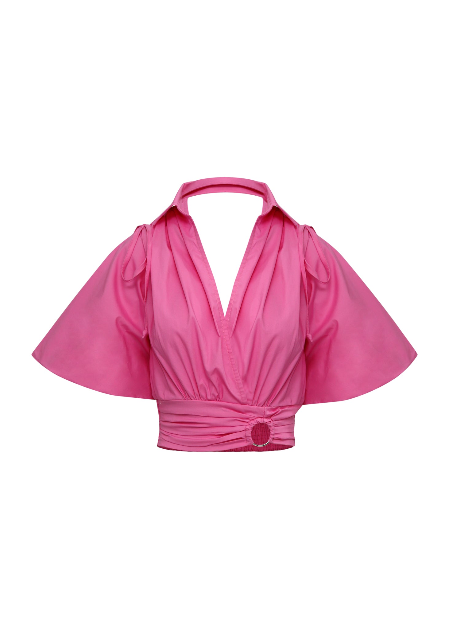 Este top cropped en un vibrante tono rosa fucsia es una declaración de estilo contemporáneo que combina una silueta envolvente con detalles de diseño audaces. Presenta un escote en V profundo y unas dramáticas mangas mariposa que aportan volumen y movimiento etéreo, mientras que la cintura se define mediante un ajuste fruncido rematado con un sofisticado herraje circular metálico. El diseño se completa con un cuello de solapa que se extiende hacia la nuca, fusionando la estructura de la camisería con la ligereza del diseño resort. Confeccionado en un tejido con cuerpo pero de caída fluida, esta pieza es ideal para crear estilismos de alto impacto que equilibran la feminidad romántica con una estética moderna y arquitectónica.