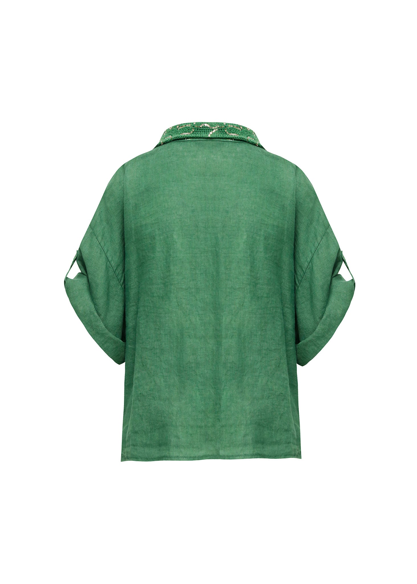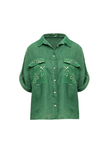 Esta blusa de lino en color verde esmeralda es una pieza que equilibra la estética utilitaria con detalles artesanales de gran delicadeza, ideal para un look veraniego sofisticado. La prenda destaca por sus bordados de encaje calado y aplicaciones de lentejuelas dispuestas de forma ornamental sobre los bolsillos de parche frontales y el cuello, aportando una textura rica y un brillo sutil. Su diseño de silueta relajada cuenta con una hilera de botones frontales a tono, cuello camisero clásico y mangas cortas de corte caído, lo que garantiza frescura y versatilidad para transicionar de un atuendo informal a uno más elevado con facilidad.