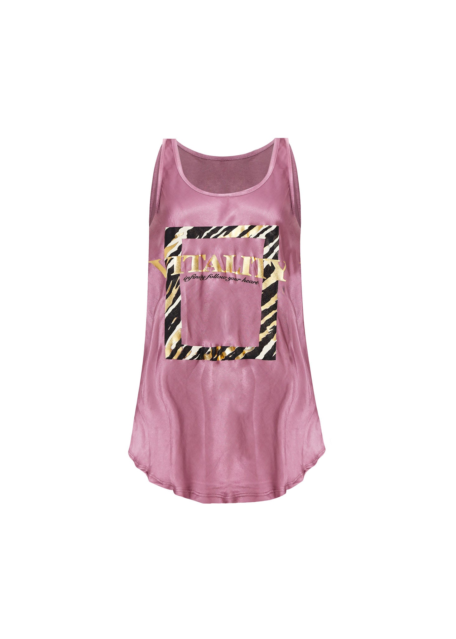 El elemento protagonista es el diseño gráfico central, que presenta un marco rectangular con un vibrante estampado de cebra en tonos negro y dorado. Sobre este fondo, resalta la palabra "VITALITY" en letras doradas metalizadas, acompañada de la frase motivadora "infinity follow your heart" en una tipografía cursiva delicada. Con un escote redondo clásico y un bajo redondeado, esta prenda es ideal para quienes buscan un "look" casual elevado, perfecto para combinar con denim o prendas de cuero y añadir un toque de energía y brillo al atuendo diario.