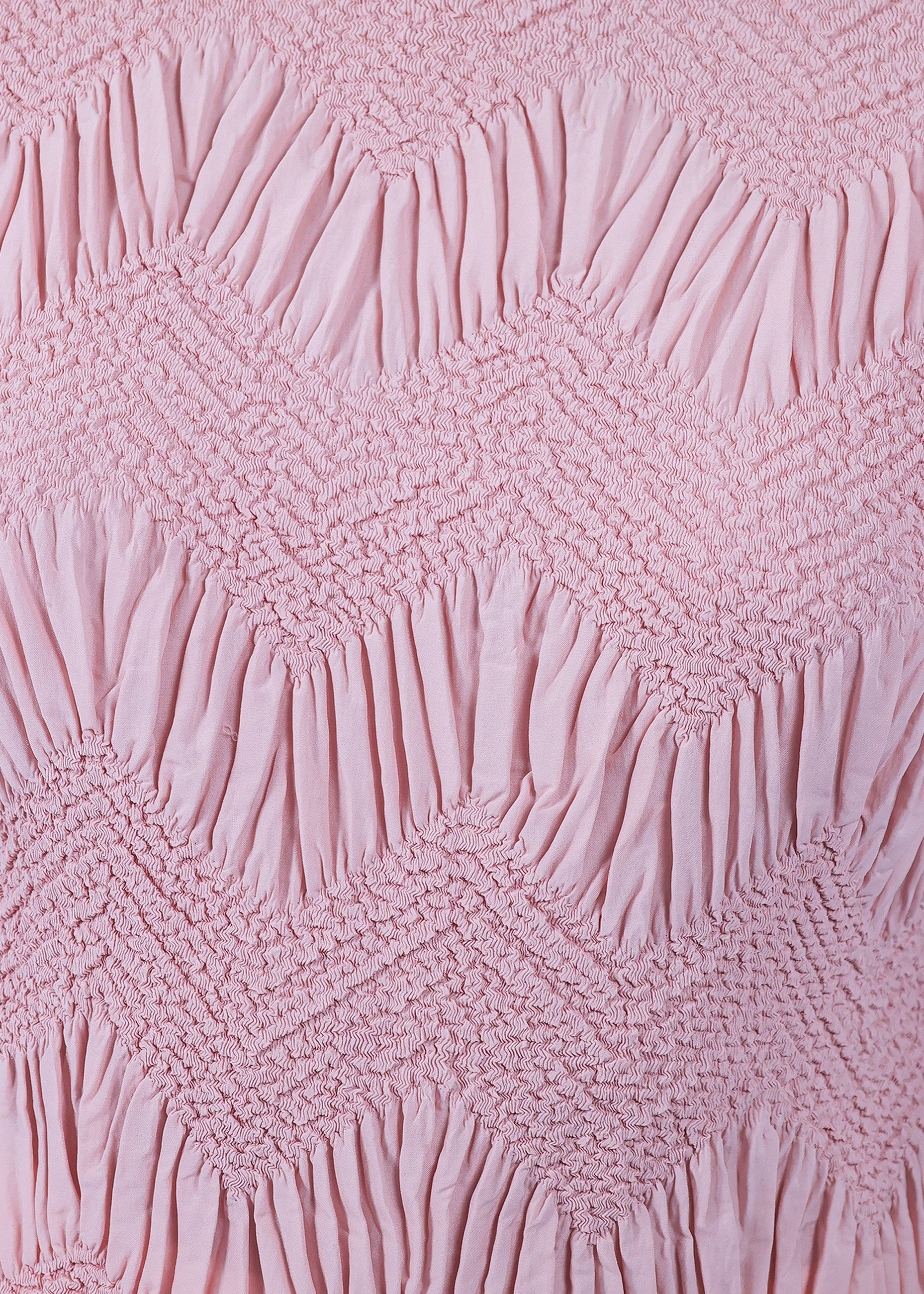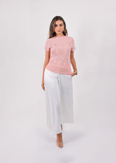 Esta blusa de cuello redondo y manga corta en un suave tono rosa empolvado es una pieza que destaca por su increíble riqueza táctil y visual. La prenda está confeccionada íntegramente con una técnica de tejido plisado y fruncido que crea un dinámico patrón de zigzag o espiga en relieve sobre toda su superficie. Este acabado elástico no solo aporta una textura tridimensional única, sino que permite que la prenda se adapte cómodamente a la silueta, mientras que los remates ondulados en el cuello, las mangas y el bajo añaden un toque romántico y delicado. Es una blusa versátil y sofisticada, perfecta para añadir profundidad y un aire contemporáneo a cualquier conjunto femenino.