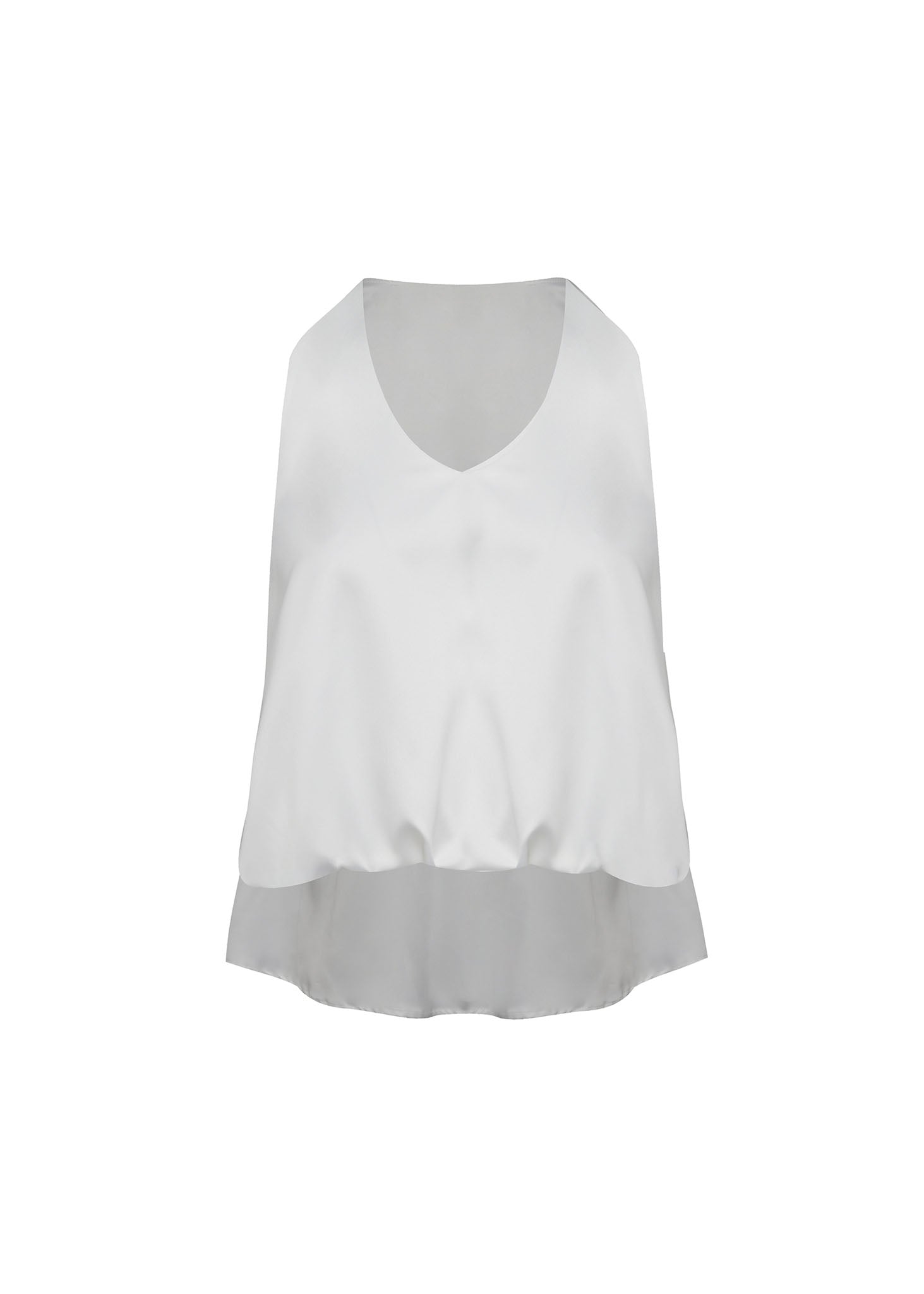 Esta blusa sin mangas en color blanco óptico es una pieza de diseño minimalista que utiliza el volumen y el drapeado para crear una silueta de impacto arquitectónico. La prenda destaca por su escote en "V" de líneas limpias, que aporta una elegancia atemporal y estiliza el torso de manera refinada.