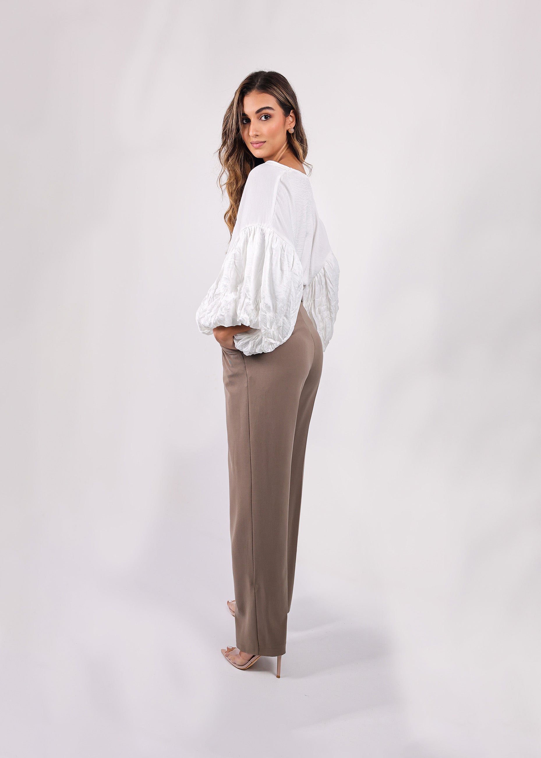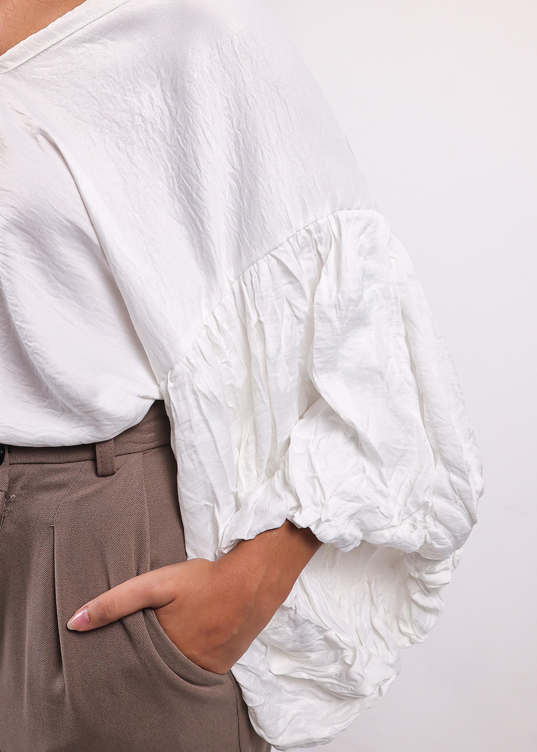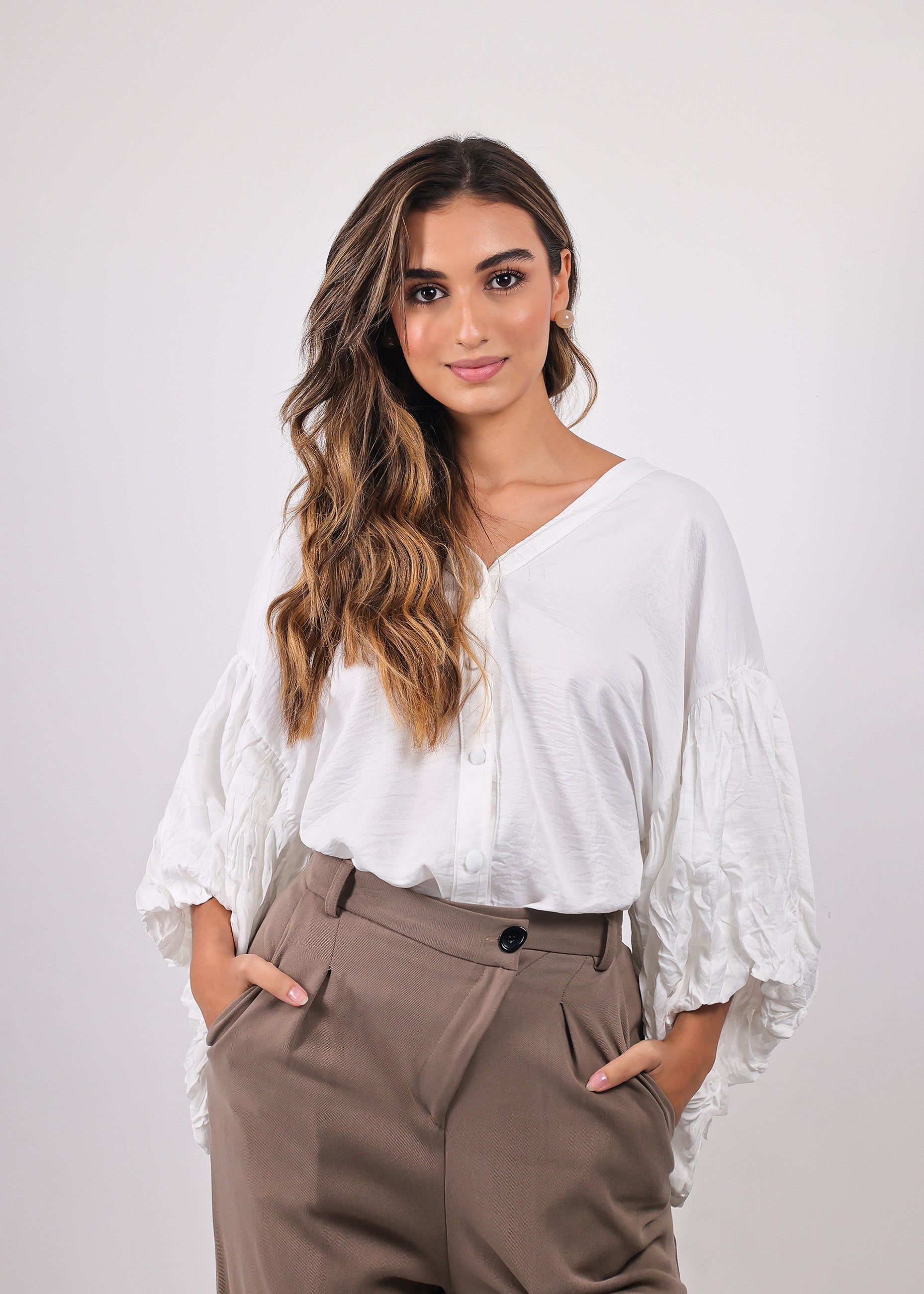 Confeccionada en un tejido ligero de color blanco roto con un sutil acabado satinado, la prenda presenta un cuerpo de corte recto y limpio con escote en "V" y cierre frontal de botones forrados a tono. El elemento protagonista son sus mangas abullonadas de volumen extremo, las cuales incorporan una textura de fruncido irregular o efecto plissé que recorre todo el brazo hasta el puño. Esta combinación de un torso simplificado con mangas esculturales redefine la blusa clásica, aportando una dimensión táctil y visual ideal para un estilismo de lujo relajado o eventos de cóctel.