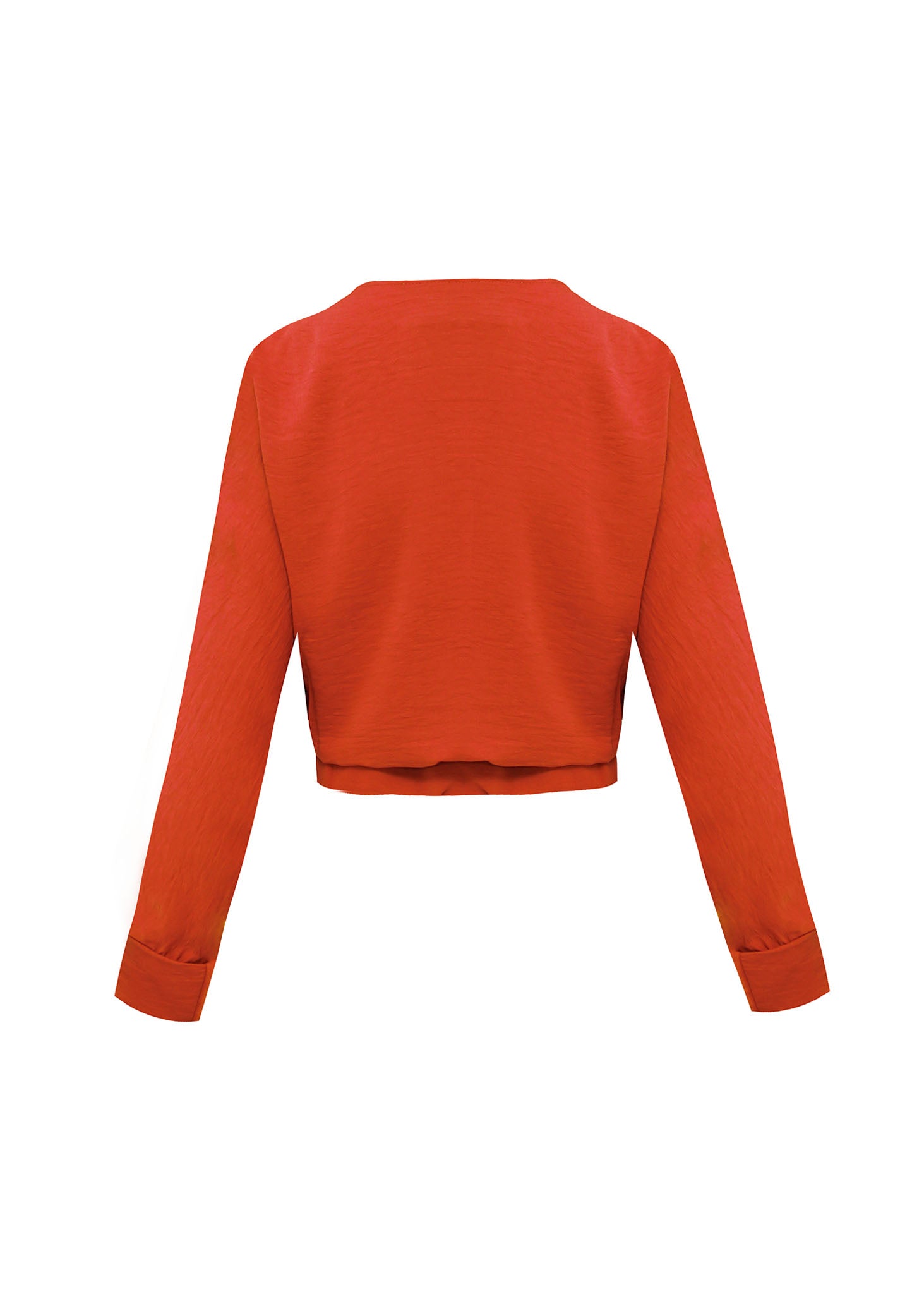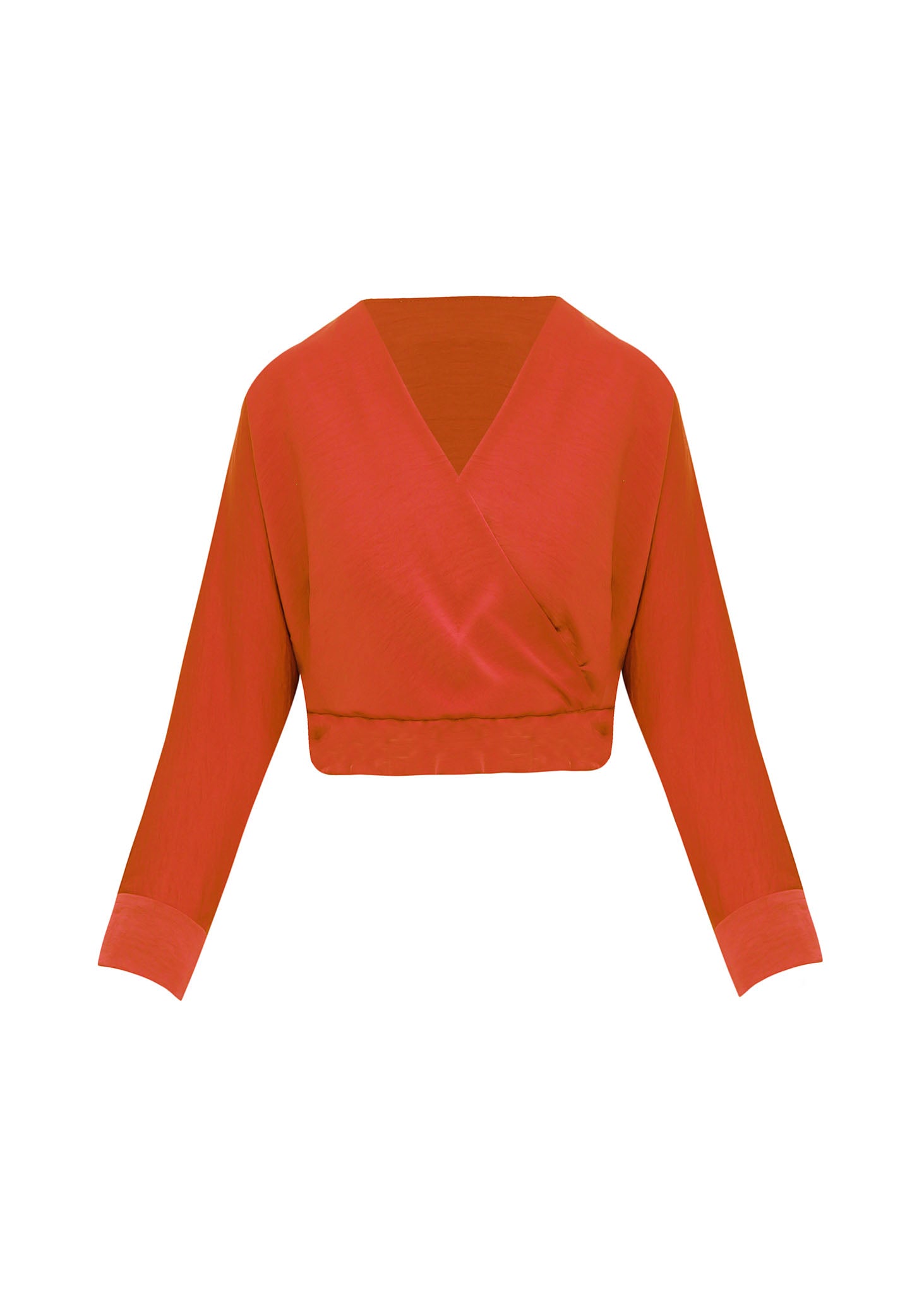 Este top de silueta corta (crop) en un vibrante tono naranja terracota es una pieza esencial que combina la sofisticación del satén con un diseño contemporáneo y favorecedor. La prenda destaca por su diseño cruzado en el frente (tipo surplice), que crea un escote en "V" profundo y elegante, acentuando la figura de forma natural.