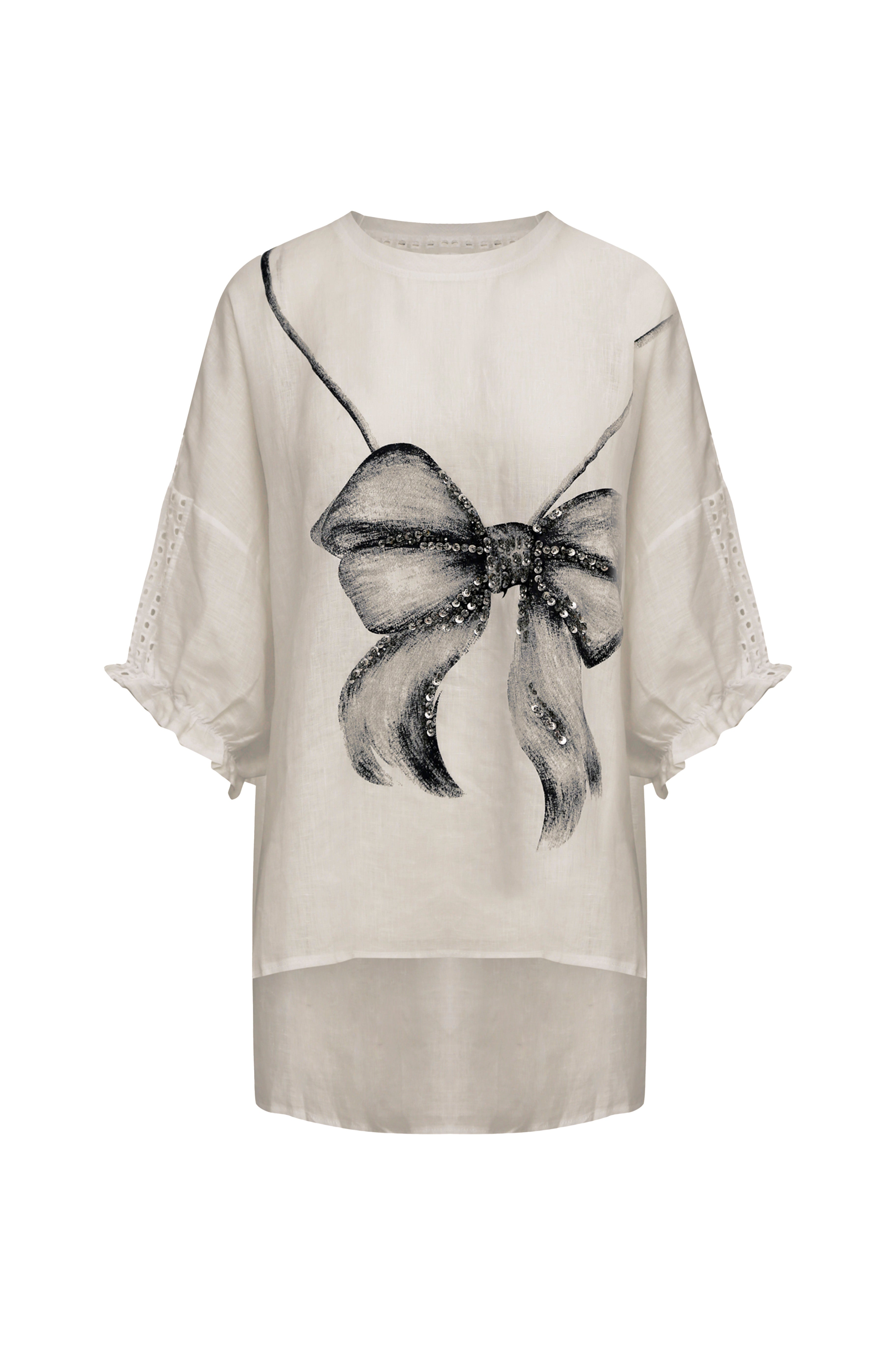 Esta blusa de silueta fluida en lino marfil es una pieza de diseño artístico que combina la frescura del tejido natural con una gráfica de alto impacto. La prenda destaca por un motivo central de lazo hiperrealista en escala de grises, ilustrado con un efecto de carboncillo y realzado con apliques de pedrería y lentejuelas plateadas que aportan un brillo tridimensional.