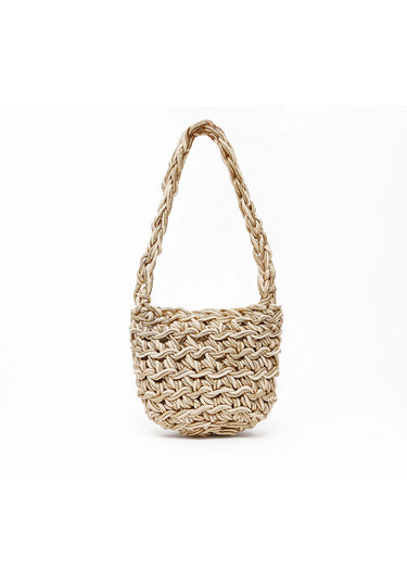 Este encantador bolso de mano presenta un tejido grueso y estructurado que combina la calidez de la fibra natural con un sutil brillo dorado/arena que capta la luz. Su diseño bucket compacto es ideal para llevar justo lo esencial con total ligereza. El asa de mano trenzada a juego complementa perfectamente el estilo artesanal, haciéndolo ideal para la playa, un paseo por la ciudad o tu próxima escapada.