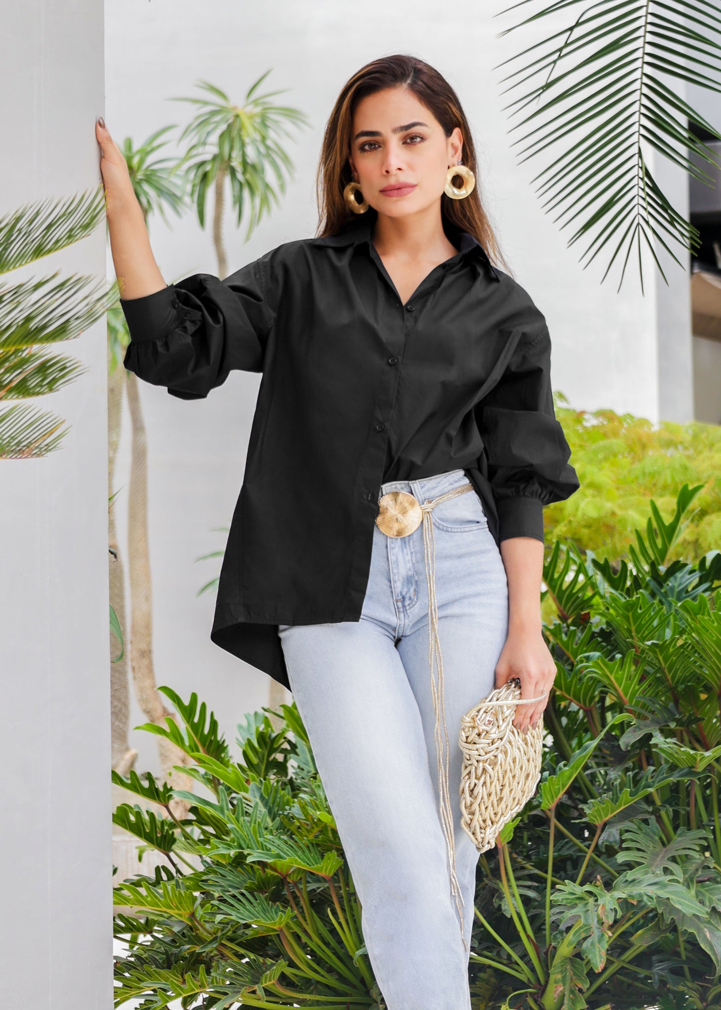 Camisa negra de estilo atemporal y sofisticado, diseñada para ofrecer versatilidad en cualquier ocasión. Su silueta elegante y moderna la convierte en un básico imprescindible que combina fácilmente tanto en looks casuales como formales.