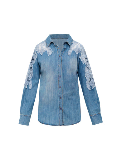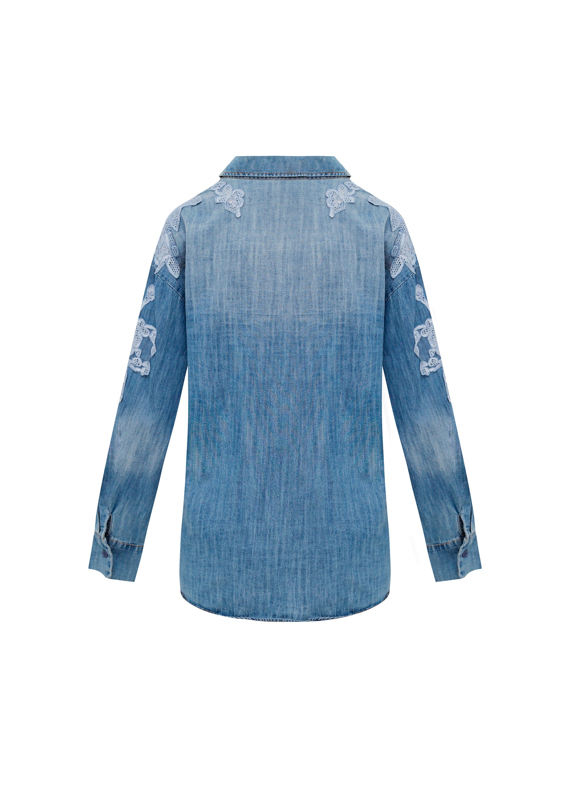 Confeccionada con un corte recto y favorecedor, presenta un cuello de solapa tradicional, cierre frontal de botones y mangas largas rematadas con puños clásicos. Este diseño transforma un básico del guardarropa en una prenda distintiva, ideal para quienes buscan un look casual-chic con un toque romántico y texturizado.