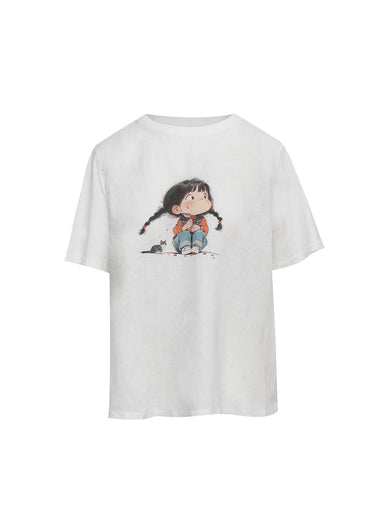 Añade un toque de ternura y nostalgia a tu estilo casual con esta Camiseta Blanca con Estampado Gráfico, una prenda básica pero con personalidad. Confeccionada en un tejido ligero y cómodo de lino, su corte clásico de cuello redondo se realza con un encantador dibujo estilo acuarela de una niña sentada con coletas. Es la camiseta perfecta para inyectar un espíritu alegre y artístico a tus jeans favoritos, ideal para looks relajados de fin de semana o como una pieza divertida para superponer.
