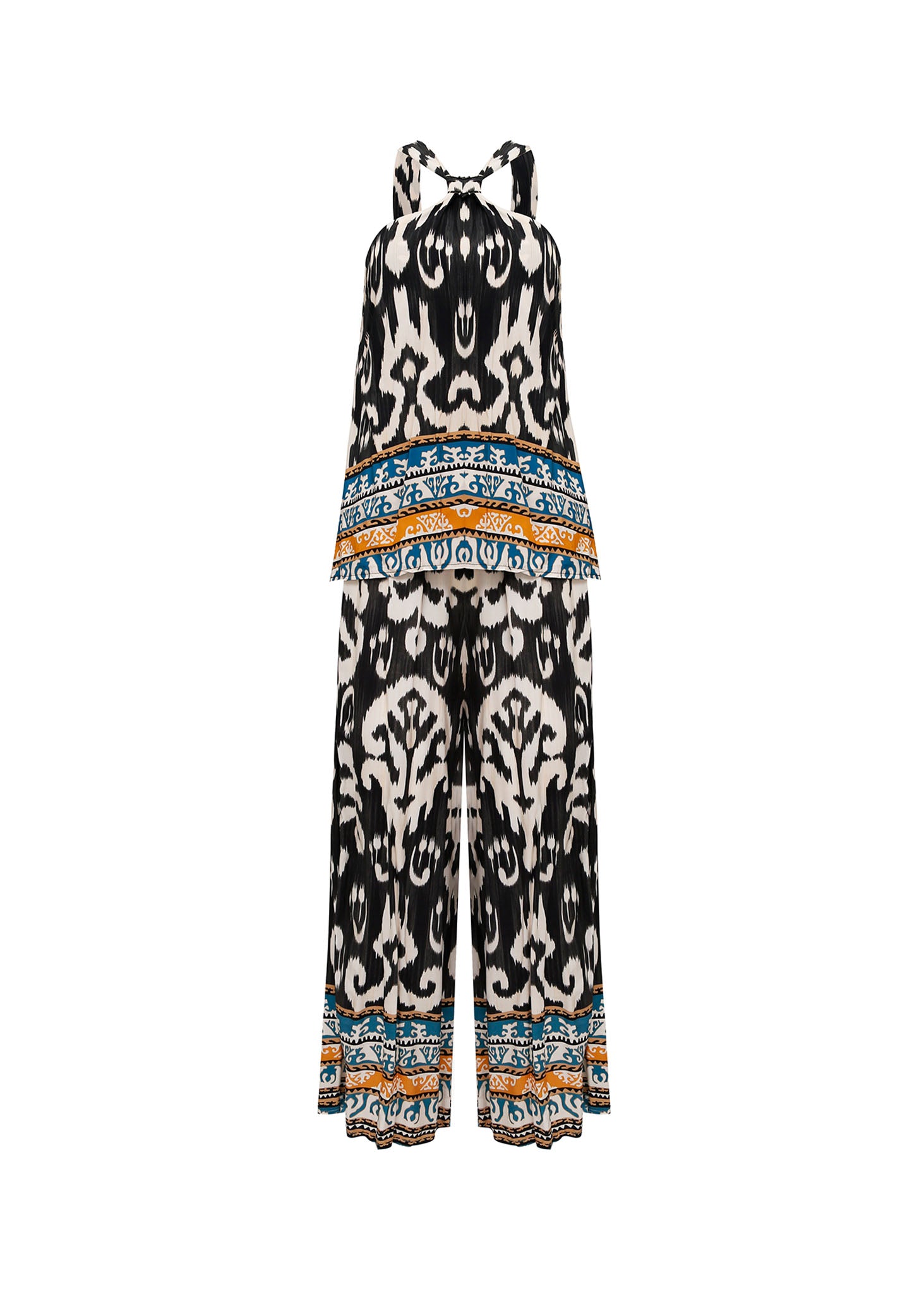 El conjunto presenta un moderno estampado tipo Ikat en tonos negro y crema, acentuado con vibrantes detalles de cenefas étnicas en naranja, amarillo y azul turquesa.