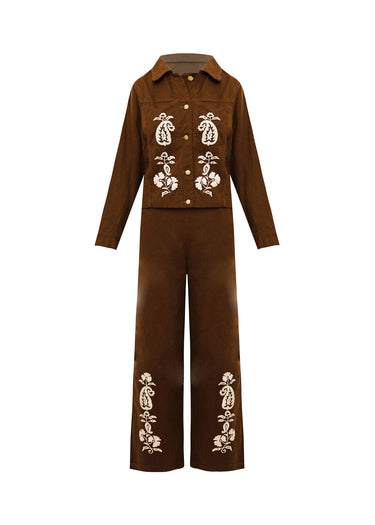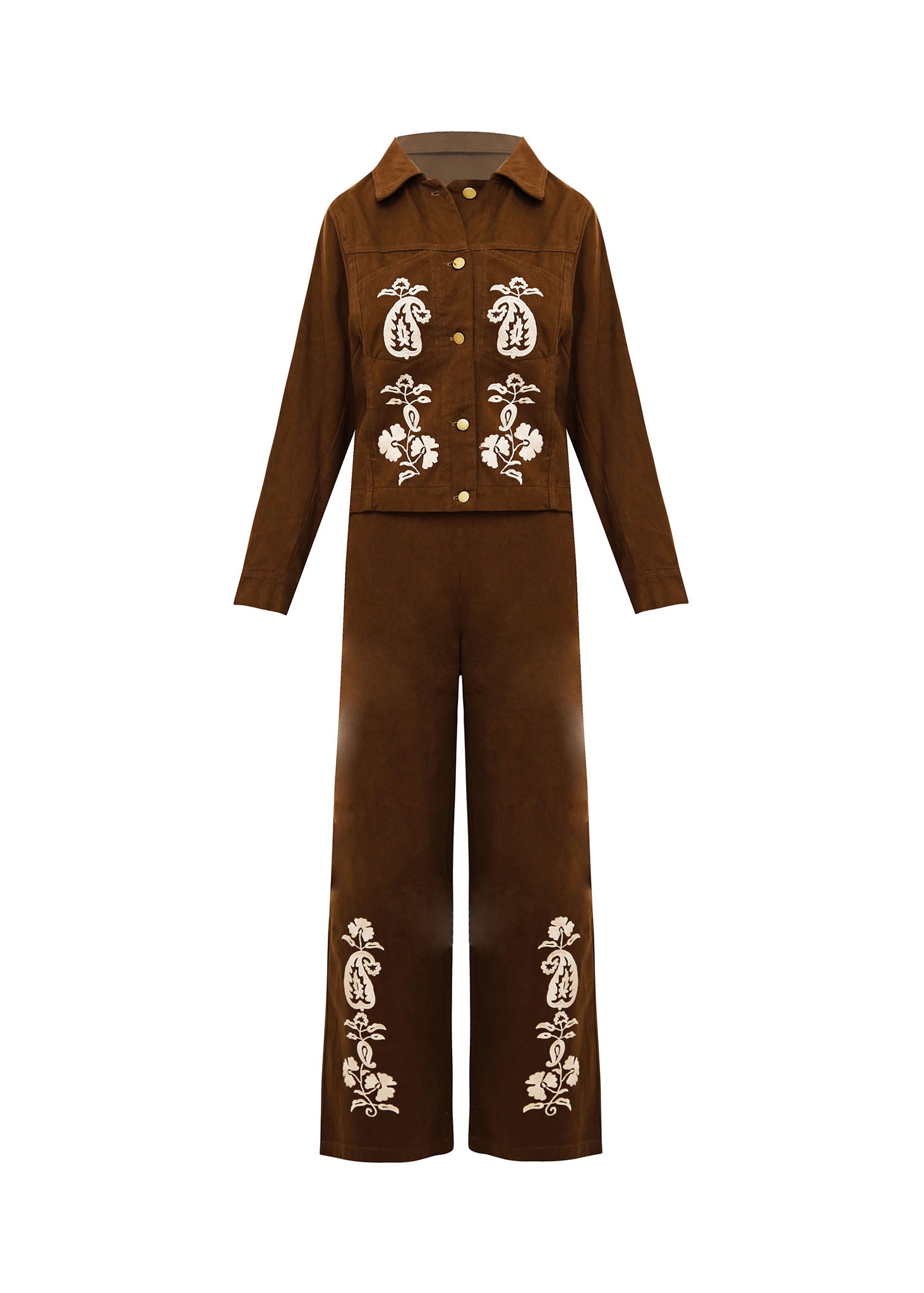 La pieza destaca por sus bordados simétricos en color crema, que despliegan intrincados motivos de cachemira (paisley) y flores silvestres en el pecho de la chaqueta y en los laterales inferiores del pantalón. La chaqueta cuenta con un cuello tradicional, botones metálicos dorados que añaden un toque de brillo y un corte que llega justo a la cintura, mientras que el pantalón mantiene una línea fluida y elegante. Es una propuesta de diseño que equilibra la calidez de los tonos tierra con la delicadeza de la ornamentación botánica, ideal para un "look" de impacto con un sello de autor distintivo.