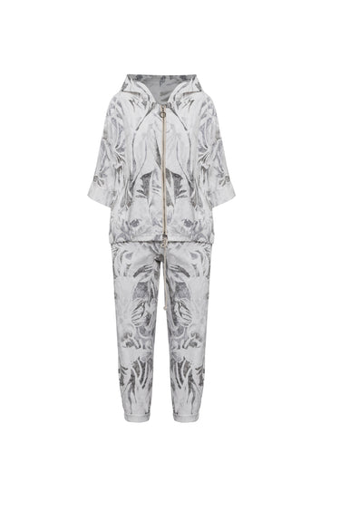 Este conjunto de dos piezas fusiona la comodidad absoluta con una estética visual de alto impacto. La chaqueta, de silueta relajada con capucha y cierre frontal, presenta mangas tres cuartos que aportan ligereza, mientras que los pantalones de corte jogger estilizan la figura con un acabado limpio en los tobillos. El alma de la prenda reside en su estampado monocromático de inspiración orgánica y trazos abstractos en tonos grises, que se despliega sobre un fondo blanco puro emulando la técnica del grabado artístico.