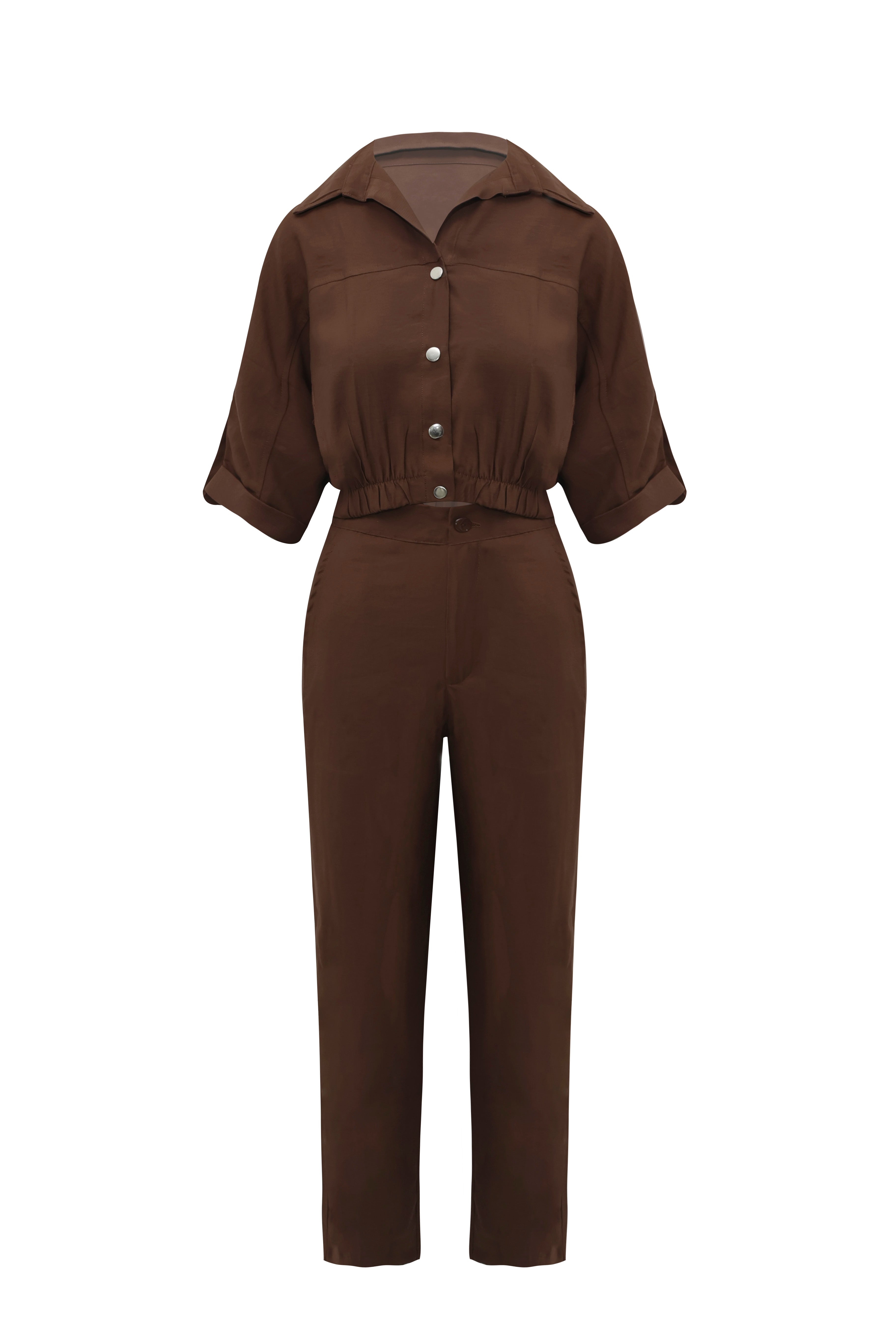 Este conjunto coordinado de dos piezas en tono teja es una propuesta de estética utilitaria y contemporánea, diseñada para ofrecer una silueta estructurada a la vez que relajada. El set está compuesto por una camisa cropped de corte boxy y pantalones de tiro alto confeccionados en un tejido con textura técnica y caída fluida.