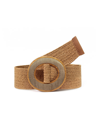 Define tu cintura con la textura orgánica que es esencial para el estilo boho y resort. Este cinturón presenta una tira ancha brillante confeccionada en rafia o paja trenzada. La pieza central es la hebilla de forma ovalada, con un acabado de madera veteada en un tono marrón oscuro y un cierre simple. El contraste entre la textura tejida de la tira y la suavidad de la madera pulida crea un look sofisticado y terroso. Es el accesorio perfecto para estilizar vestidos midi, monos de lino o faldas de verano.