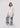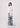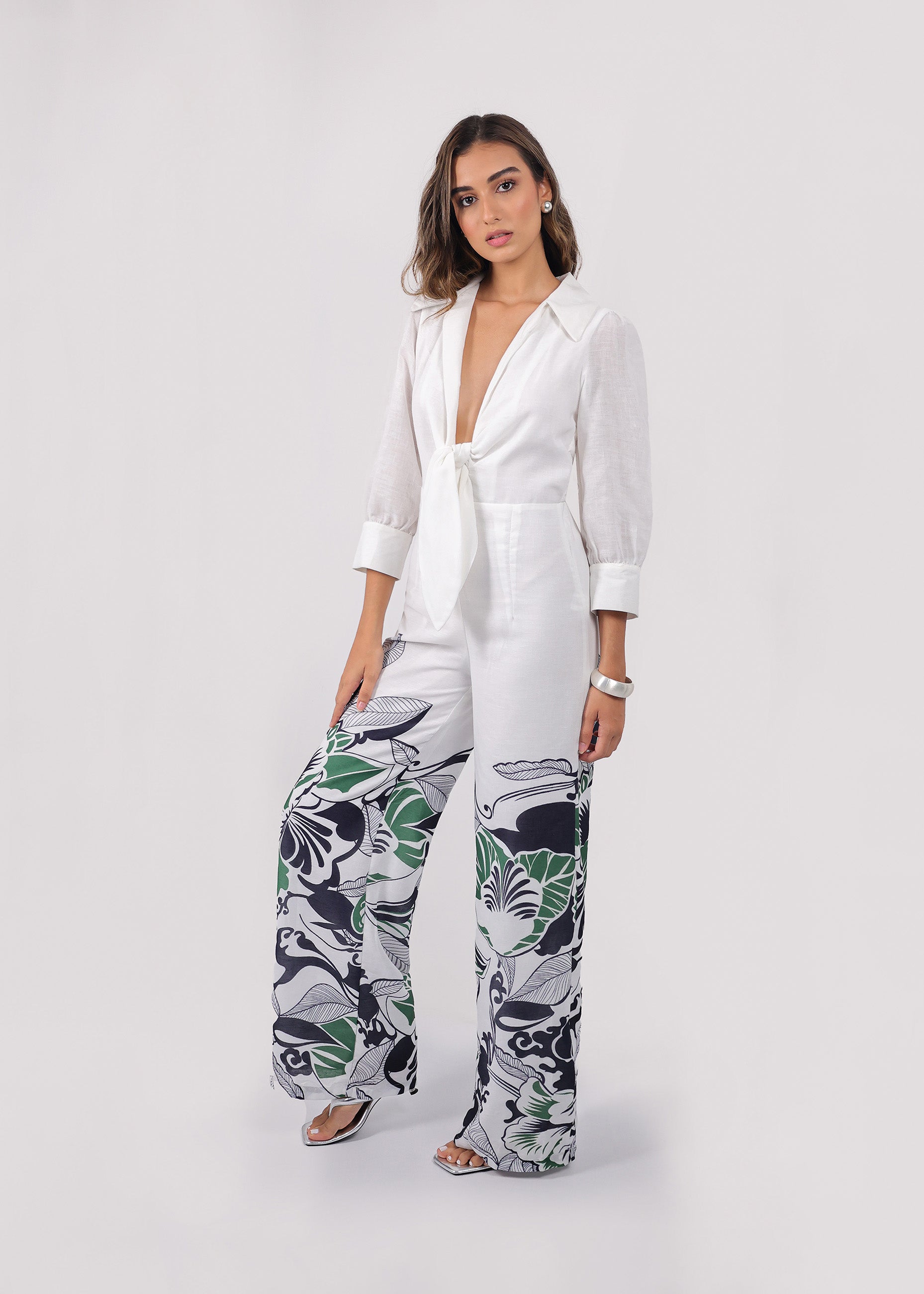 Confeccionado en un tejido blanco de apariencia estructurada, la prenda presenta un cuerpo superior de estilo camisero con cuello de solapa y un profundo escote en "V" que se resuelve en un nudo lazo frontal decorativo. Las mangas de largo tres cuartos cuentan con un sutil volumen abullonado y terminan en puños anchos de corte limpio. La parte inferior consiste en un pantalón de silueta palazzo de pernera ancha, el cual sirve de lienzo para un estampado botánico artístico en tonos azul marino y verde bosque. El patrón, que muestra flores y follaje de gran escala con trazos lineales, está estratégicamente posicionado desde las rodillas hasta el bajo, logrando un equilibrio visual que alarga la figura y aporta un carácter escultural a la pieza.