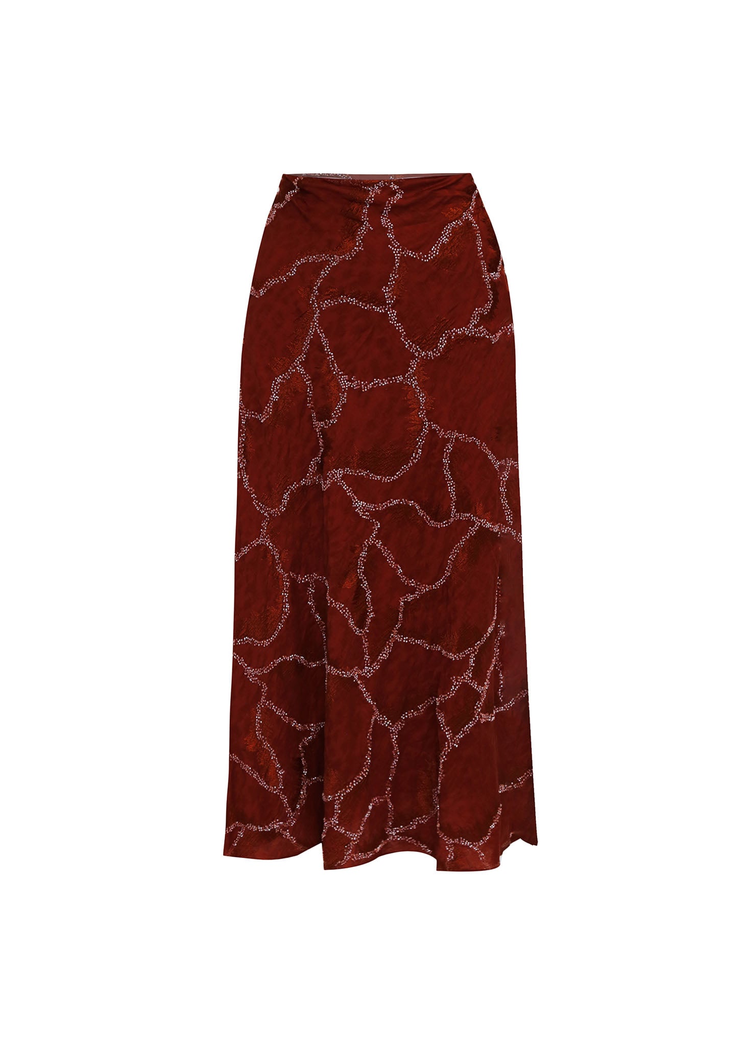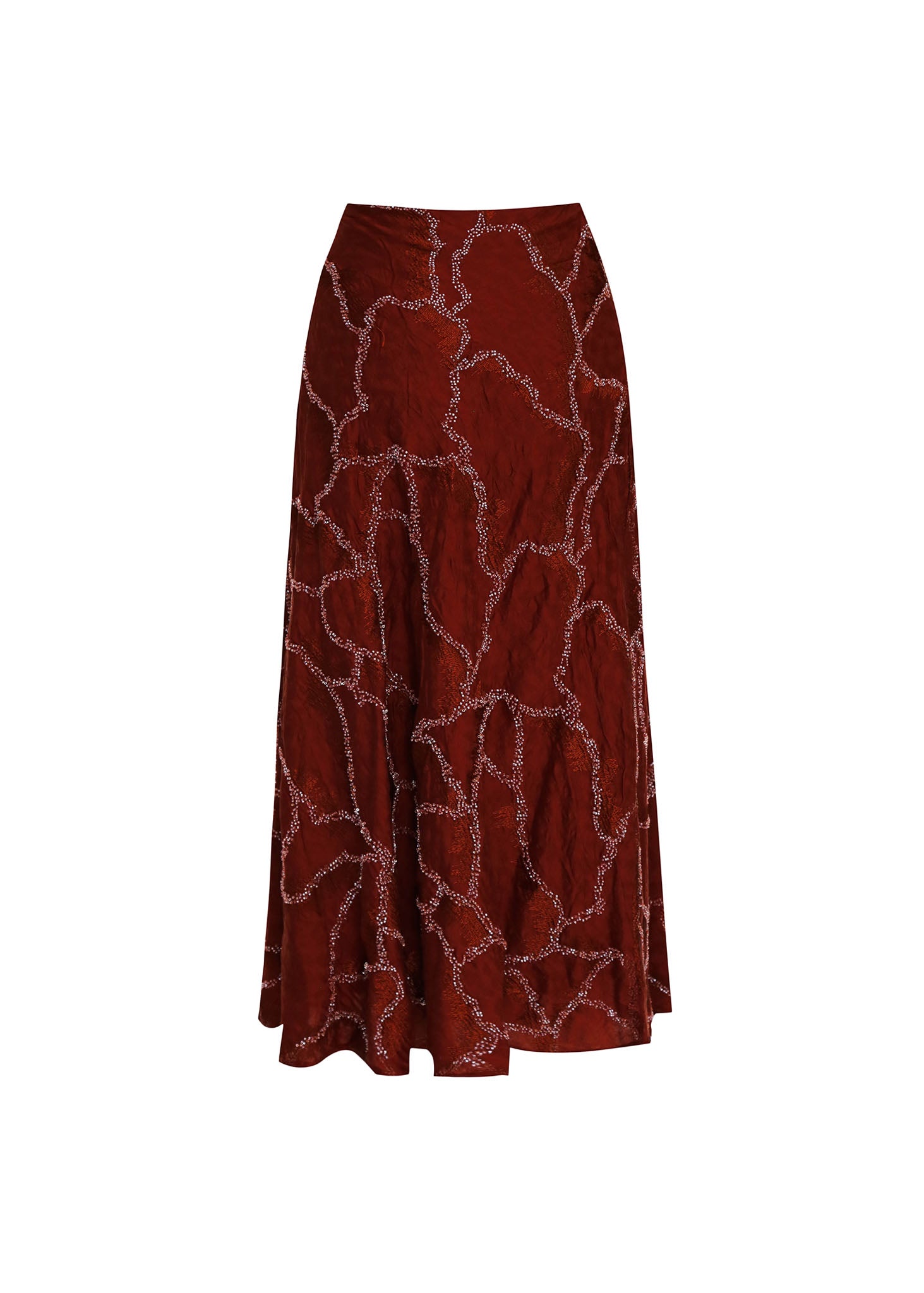 Falda de corte largo o midi confeccionada en satén de alta calidad en un intenso color vino tinto o burdeos. El tejido fluido ofrece un brillo lujoso y una caída elegante.La falda presenta un drapeado (draping) estratégico y volumen asimétrico en la parte superior/cadera. La silueta es ajustada hasta la rodilla, donde se ensancha en un bajo acampanado o de volante con pliegues marcados, lo que proporciona un movimiento sofisticado.