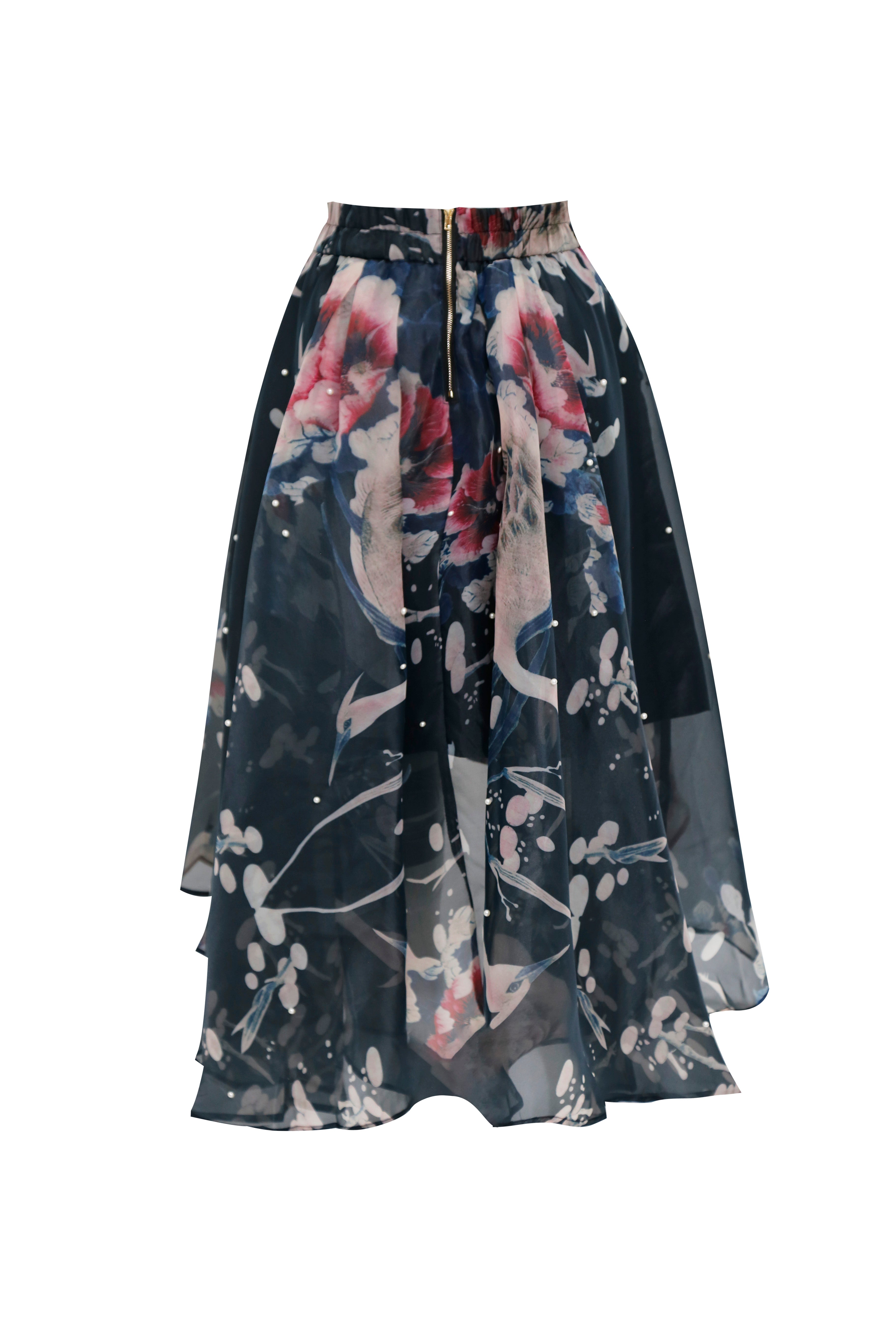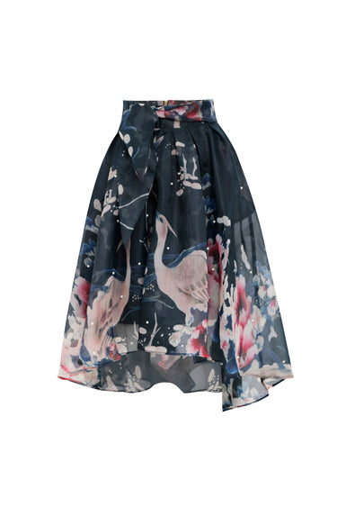 Esta falda midi de silueta evasé es una pieza de estética etérea y romántica que destaca por su riqueza visual y acabados de lujo. Confeccionada en un tejido traslúcido con cuerpo, presenta un estampado pictórico de grullas y motivos botánicos en una paleta de tonos empolvados sobre un fondo oscuro, evocando el arte tradicional asiático.