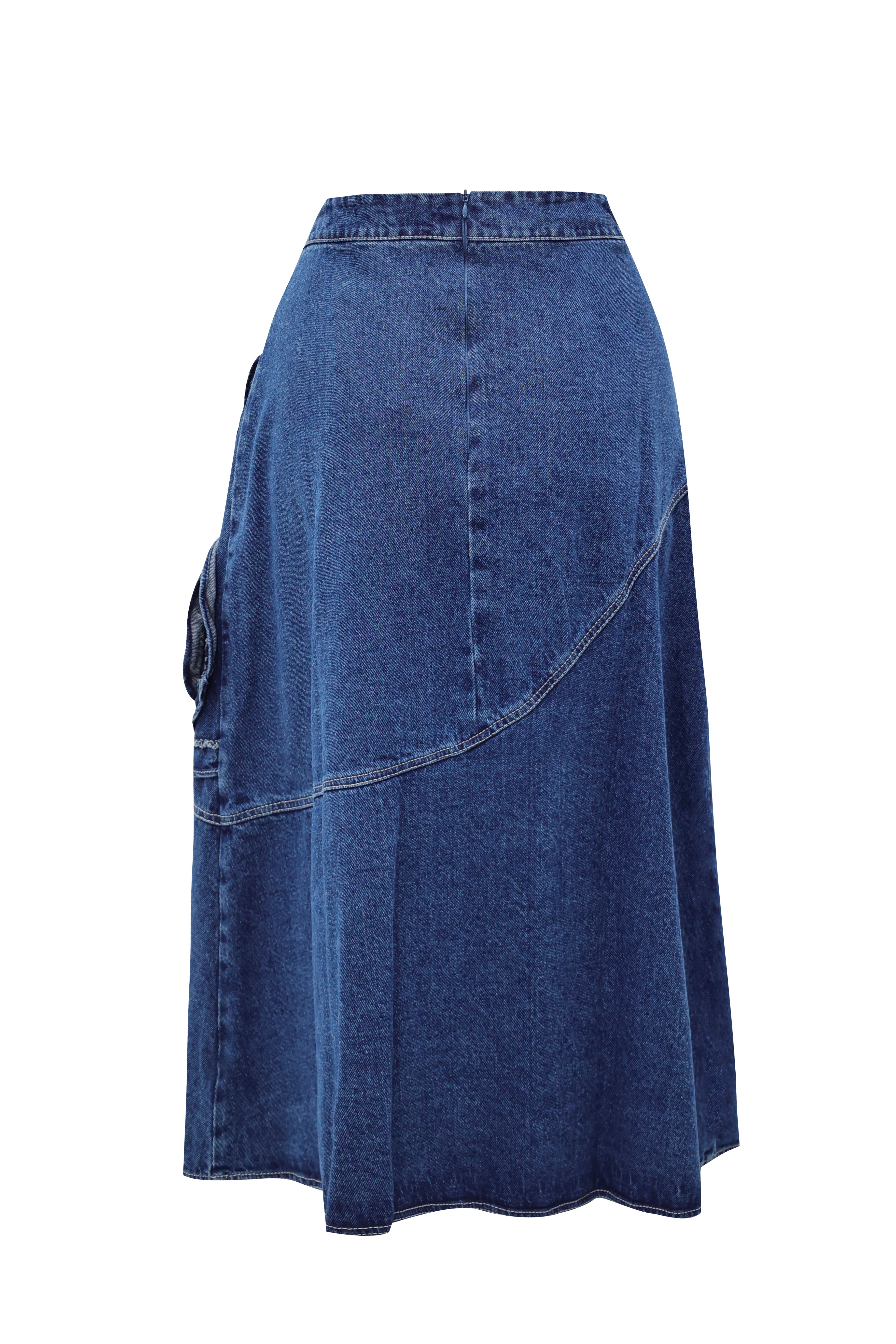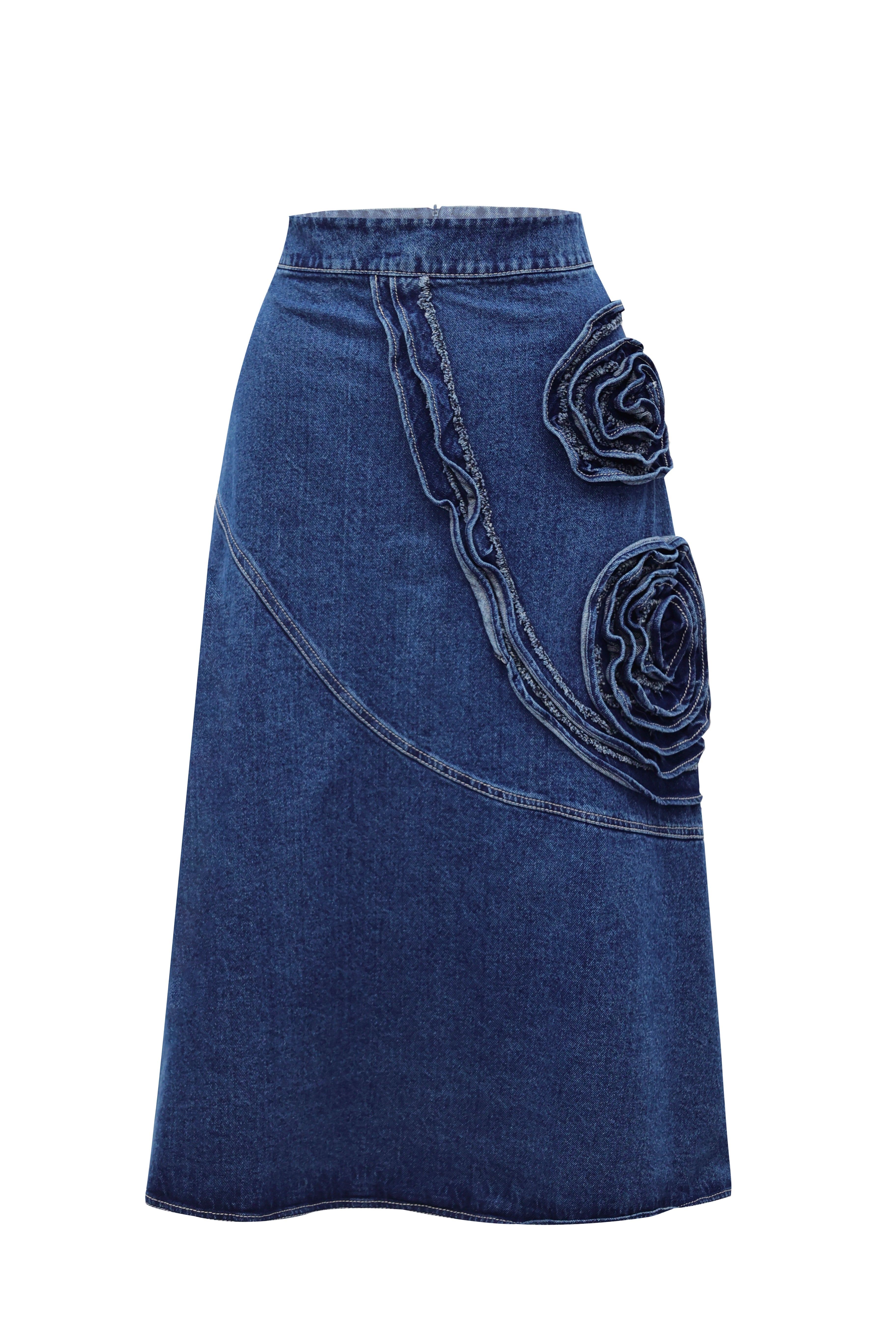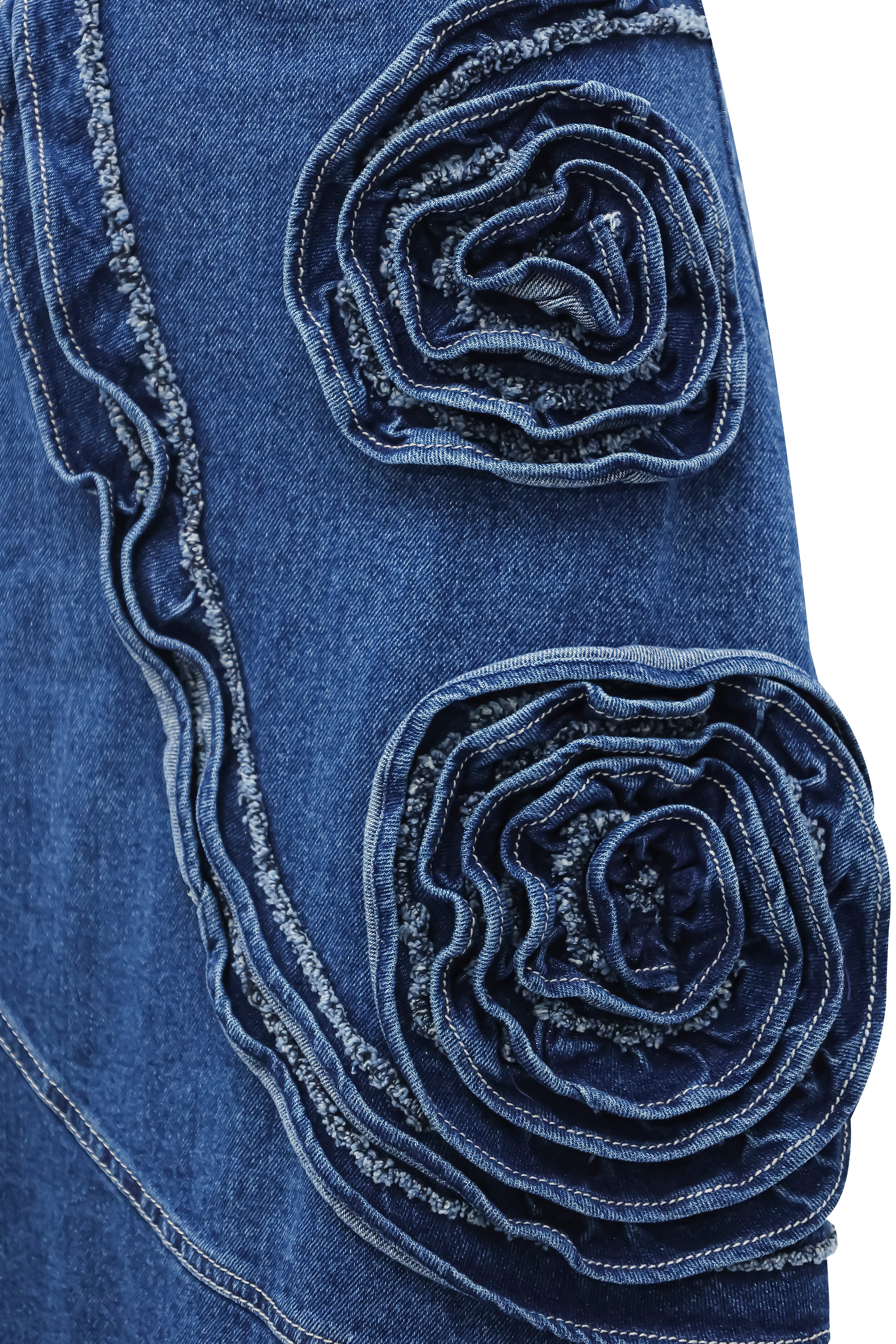 Esta falda midi en denim de lavado medio es una pieza de diseño escultural que eleva el concepto del vaquero tradicional mediante aplicaciones tridimensionales y juegos de texturas. La prenda presenta una silueta de corte evasé que destaca por un panel lateral decorado con rosas artesanales confeccionadas en el propio denim, logrando un relieve visual de alto impacto. El diseño se enriquece con costuras curvas decorativas y acabados de vivos deshilachados que recorren la estructura, aportando un aire bohemio y vanguardista que fusiona la robustez del tejido con una delicadeza romántica y arquitectónica.