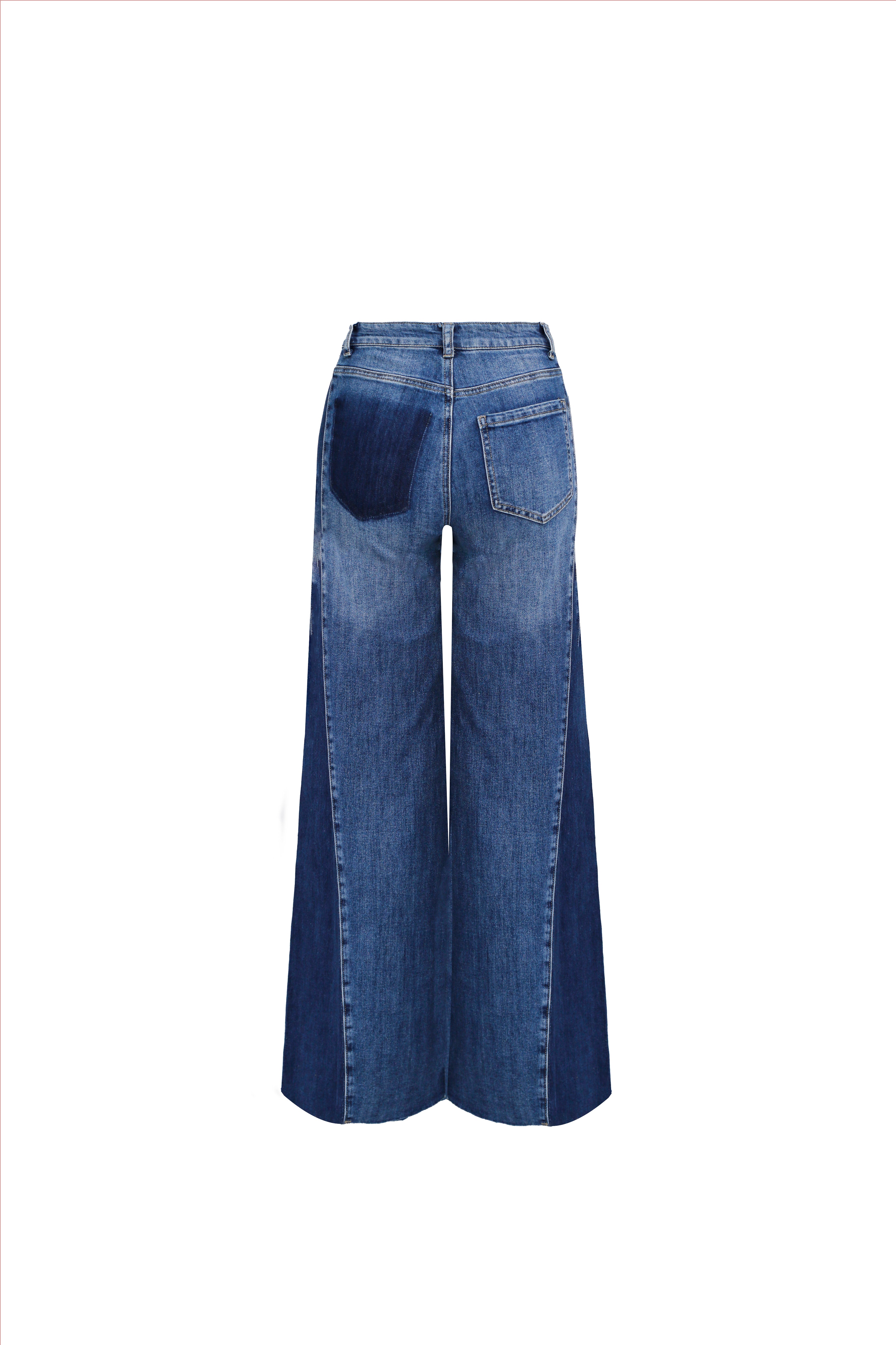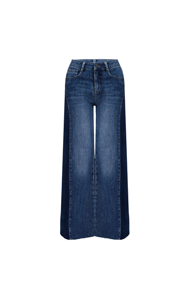 Estos pantalones vaqueros de corte extra ancho son una pieza de diseño arquitectónico que juega con los contrastes cromáticos del denim. La prenda destaca por su innovadora construcción en paneles de dos tonos: un lavado azul medio en la parte frontal y posterior que contrasta fuertemente con franjas laterales en un denim azul marino mucho más oscuro. Este detalle visual no solo aporta una estética vanguardista, sino que crea un efecto de verticalidad que estiliza la silueta de pernera ancha. Con un tiro alto clásico y bajos de corte limpio sin costura visible, estos pantalones transforman un material tradicional en una prenda de tendencia con gran presencia estructural.