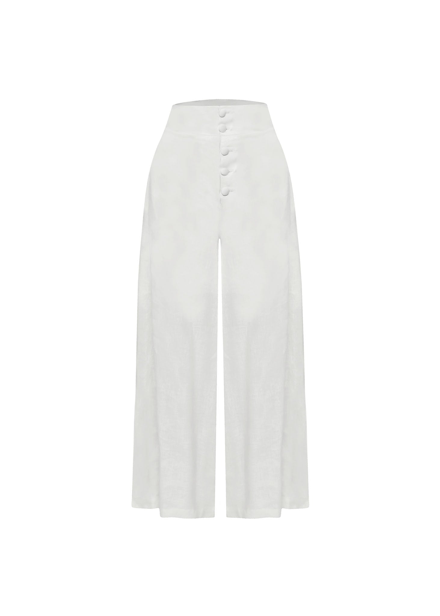 Este pantalón de silueta palazzo encarna la elegancia atemporal y la frescura del estilo resort. Confeccionado en un tejido de lino premium en color blanco óptico, la prenda destaca por su caída fluida y su estructura de tiro alto que alarga visualmente la figura. El elemento central del diseño es su sofisticada botonadura frontal, compuesta por una hilera de botones forrados en la misma tela, que aportan un detalle de sastrería artesanal y pulida. Su corte de pierna ancha proporciona un movimiento orgánico y ligero, mientras que la pretina lisa asegura un ajuste impecable en la cintura. Es una pieza versátil y lujosa, ideal para conjuntos monocromáticos de verano o eventos formales durante el día.