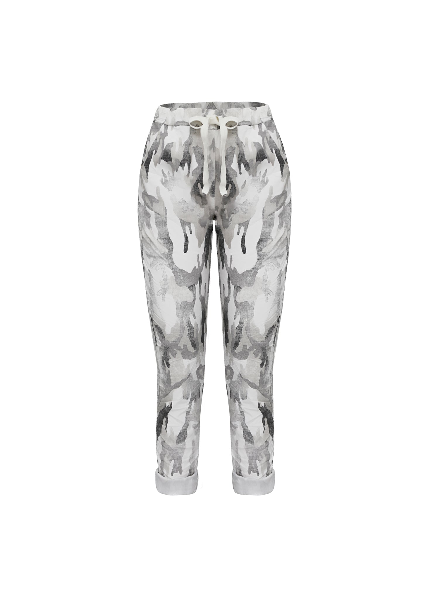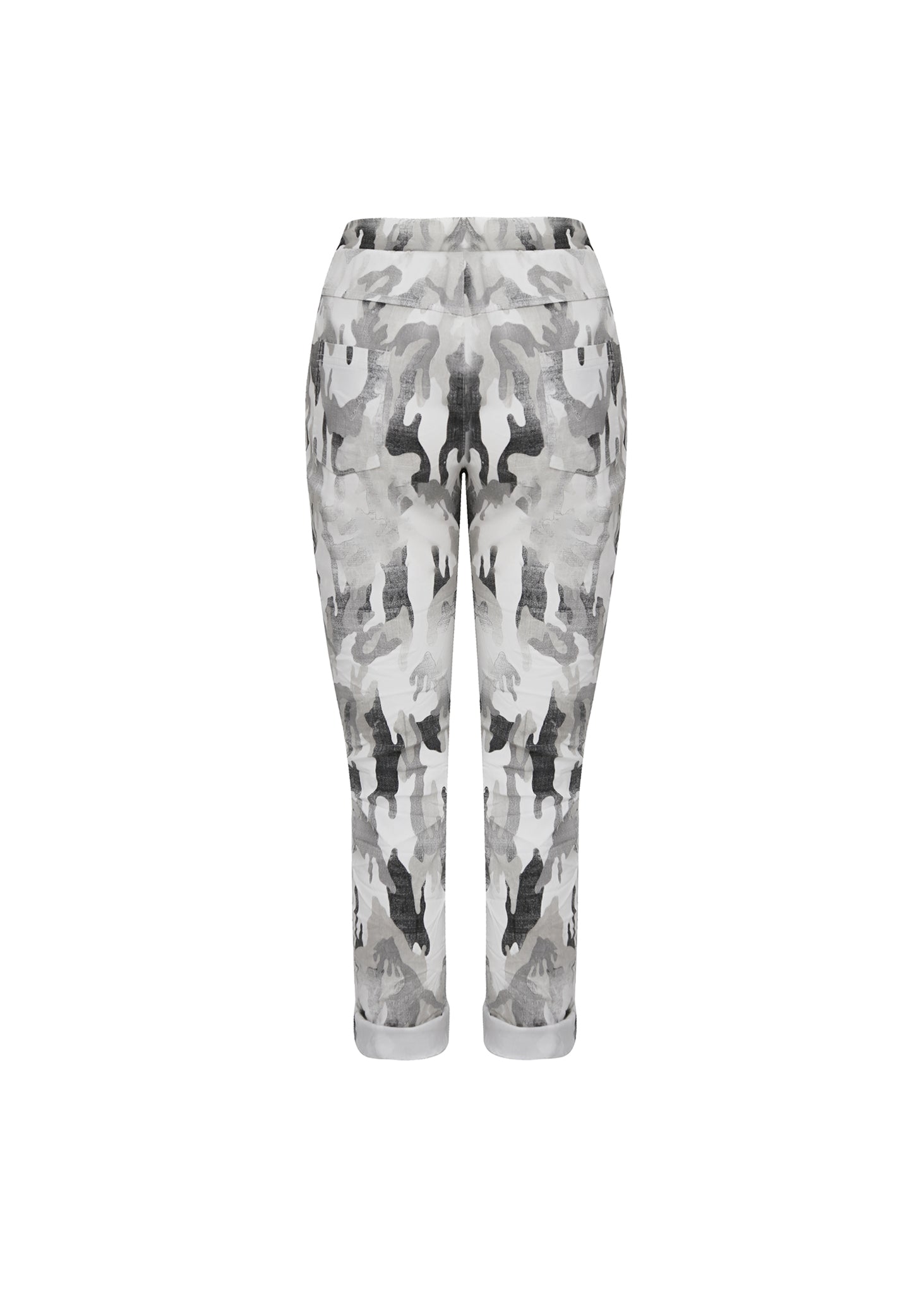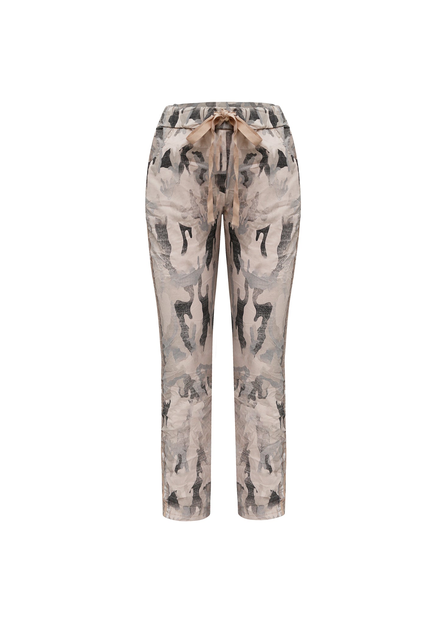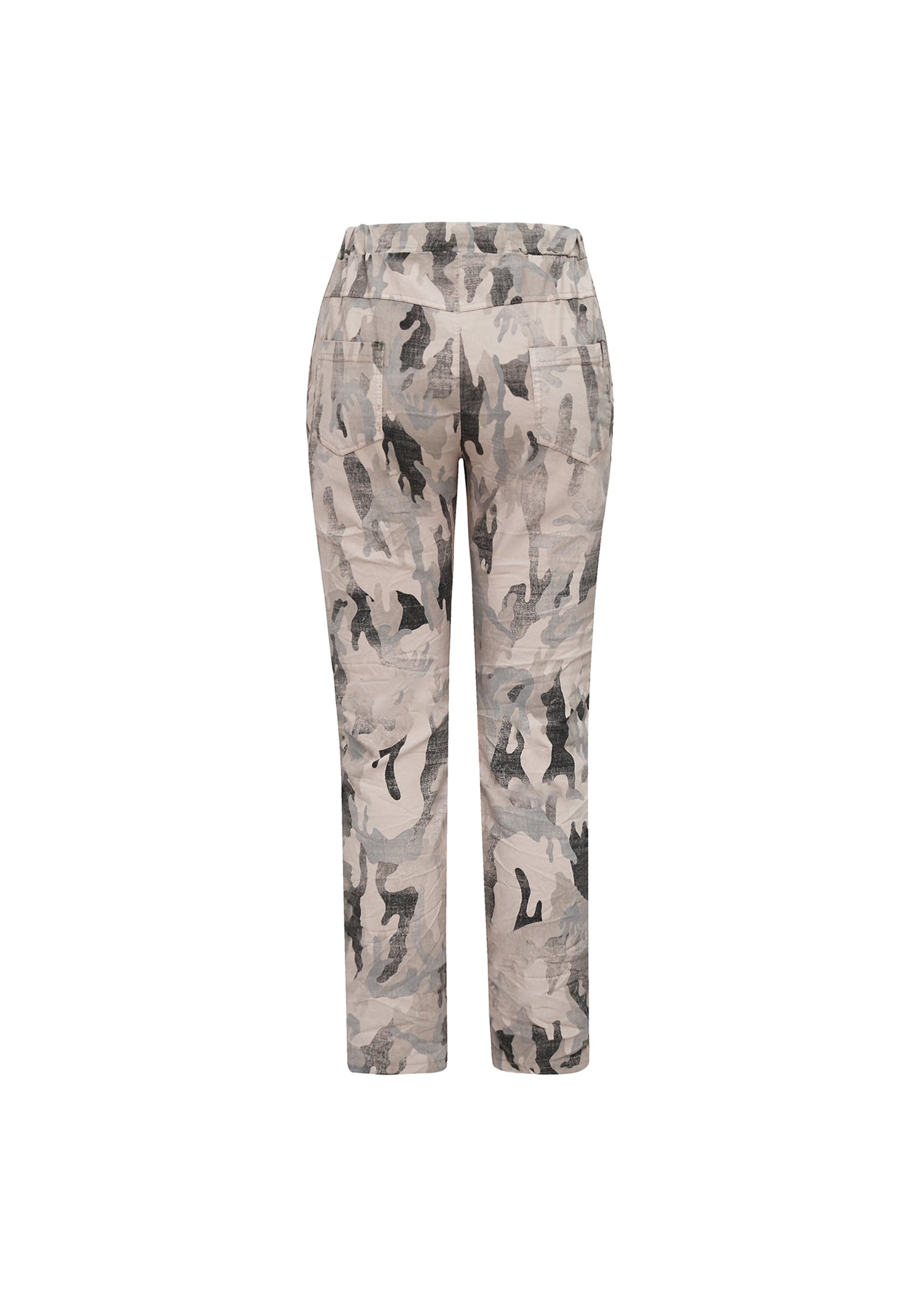 Esta pieza es un pantalón de corte cónico (tapered) con un diseño de cintura alta y elástica, definido por su silueta relaxed y su ajuste cómodo. Está confeccionado en un tejido ligero y con una caída fluida, ideal para un estilismo de transición.El rasgo principal es su estampado abstracto o camo desdibujado que se extiende por toda la superficie. La paleta de color es sumamente sutil y refinada, combinando una base de tono nude o rosa pálido empolvado con motivos de gris piedra y negro desgastado. Este print crea un efecto de profundidad visual y arte wearable.
