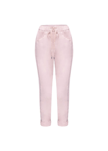 Eleva tu sporty chic con el Pantalón Jogger 'Lujo Urbano', una pieza que redefine la comodidad de lujo. Confeccionado en un tejido suave y con caída, en un delicado tono rosa blush o rosa palo, este pantalón ofrece una silueta relajada y ligeramente slouchy. El diseño de cintura elástica y el cordón ajustable con terminaciones deshilachadas garantizan un ajuste perfecto