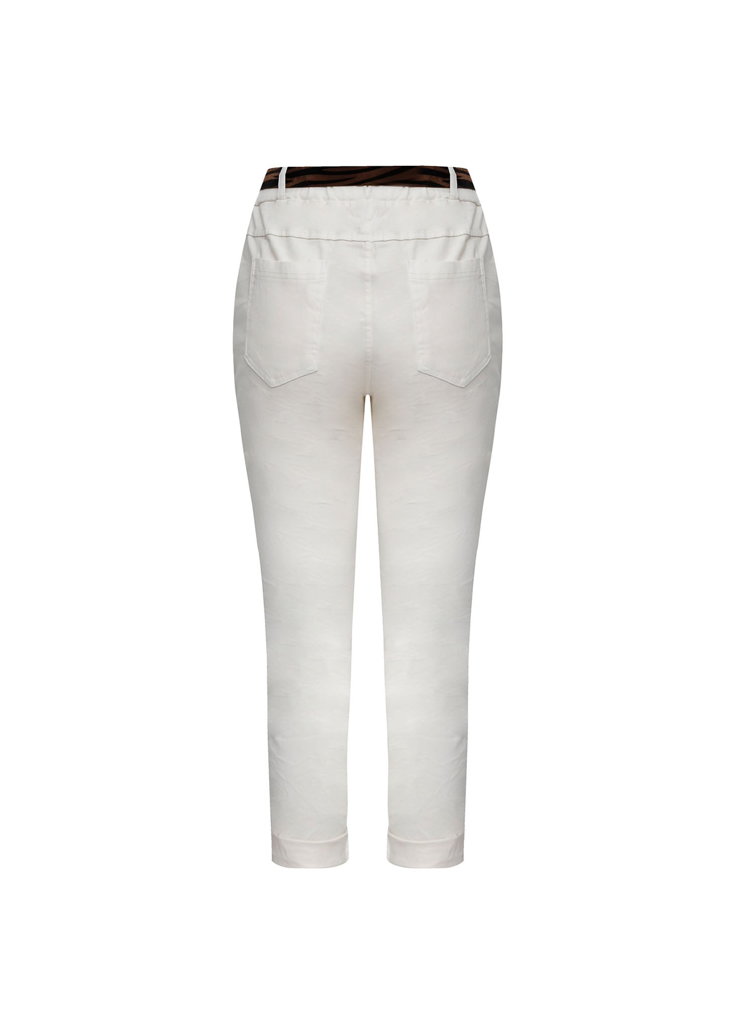 Estos pantalones de corte jogger en color blanco crudo son una pieza de estética relajada que fusiona el confort utilitario con detalles decorativos de carácter artesanal. La prenda destaca por su cintura elástica fruncida, la cual se complementa con un cinturón integrado de estampado animal en tonos tierra y una hebilla metálica dorada que eleva el diseño. Confeccionados en un tejido con cuerpo y acabado mate, los pantalones incorporan un parche decorativo lateral con tipografía bordada y bajos vueltos de forma fija, logrando una silueta contemporánea ideal para estilismos diarios que busquen un equilibrio entre la funcionalidad y el detalle distintivo.
