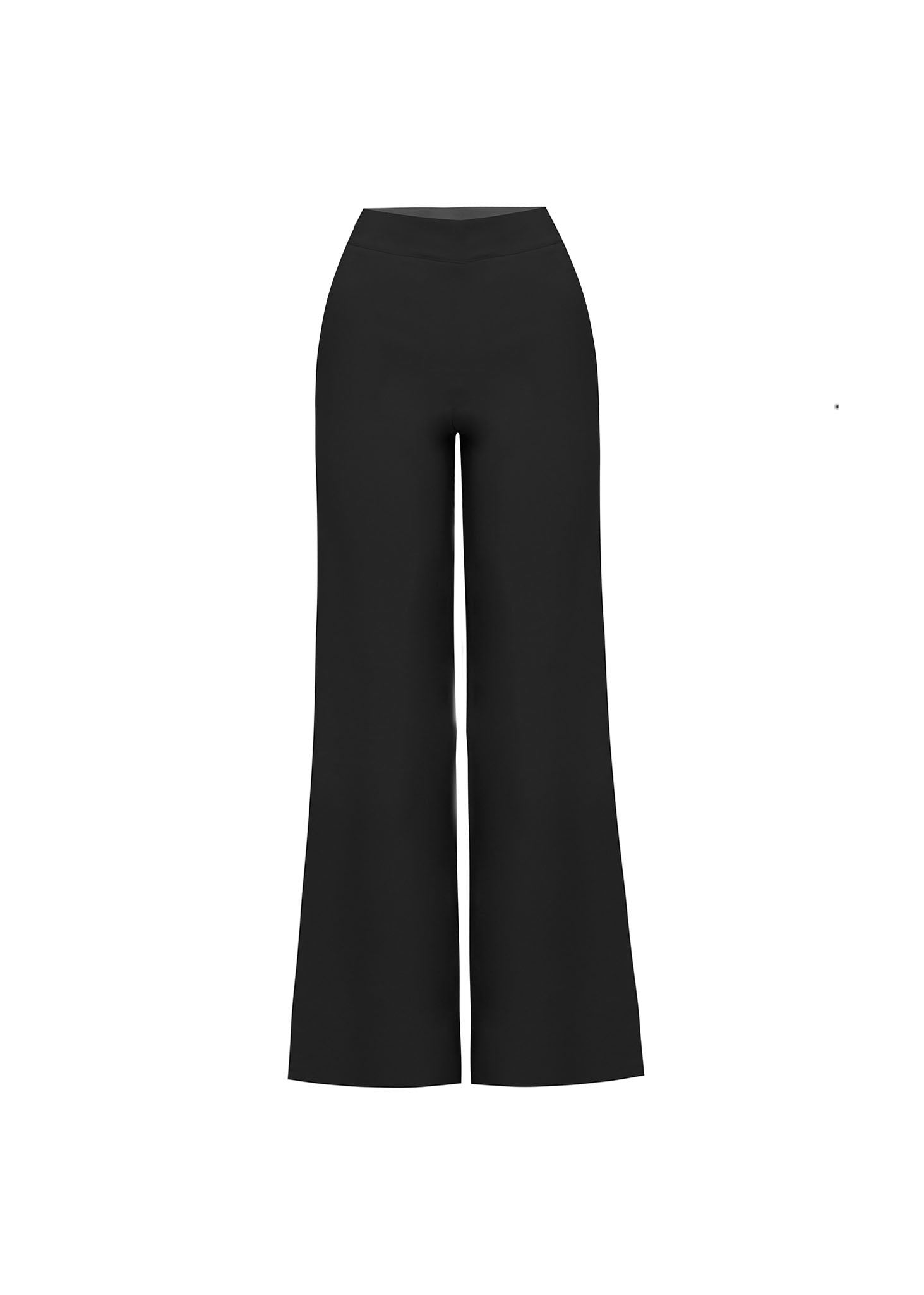 Este pantalón de silueta wide-leg representa la cumbre del minimalismo sofisticado, diseñado para alargar la figura mediante una arquitectura textil impecable. La prenda destaca por su tiro alto con pretina anatómica que enmarca la cintura con precisión, eliminando elementos visuales superfluos para mantener una estética de líneas puras. Confeccionado en un tejido de sarga con una caída pesada y fluida, la pernera se despliega de forma generosa desde la cadera hasta el bajo, creando un movimiento etéreo y elegante al caminar. Su color negro sólido y la ausencia de costuras frontales visibles potencian su versatilidad, convirtiéndolo en una pieza clave para conformar power suits contemporáneos o conjuntos de etiqueta nocturna que exigen sobriedad y un diseño de alto impacto visual.