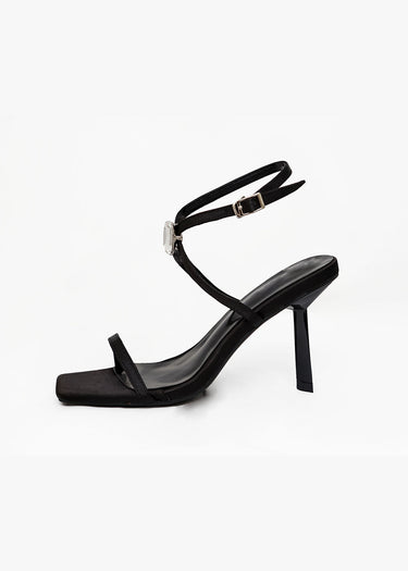 Este refinado calzado de gala destaca por su estética minimalista y escultural. Confeccionada en un color negro absoluto, la sandalia presenta una sofisticada estructura de tiras finas que enmarcan el pie con elegancia. El diseño se distingue por una pulsera doble al tobillo que incorpora una pieza central de cristal facetado en corte esmeralda, aportando un punto de luz lujoso y focal. Con una punta cuadrada (square toe) de tendencia y un tacón de aguja estilizado, esta pieza es el complemento definitivo para elevar estilismos de etiqueta, fusionando la sobriedad del diseño contemporáneo con destellos de alta joyería.