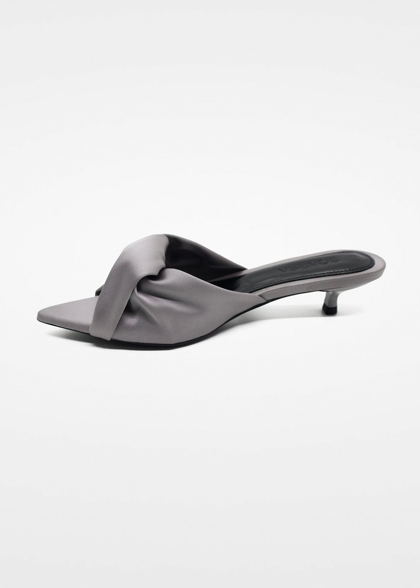 Las sandalias Satin Twist destacan por su exquisita confección en un tejido de satén premium en color gris peltre, cuyo brillo sutil añade una dimensión de lujo a cualquier conjunto.