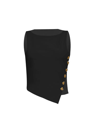Top Asimétrico con Botones Dorados es una pieza audaz y de sastrería que redefine el estilo clásico. Su color negro atemporal y el corte sin mangas se equilibran con un bajo cruzado asimétrico y una hilera de botones dorados estilo militar que añaden un punto focal de lujo y estructura. Perfecto para un look ejecutivo moderno o una noche elegante.