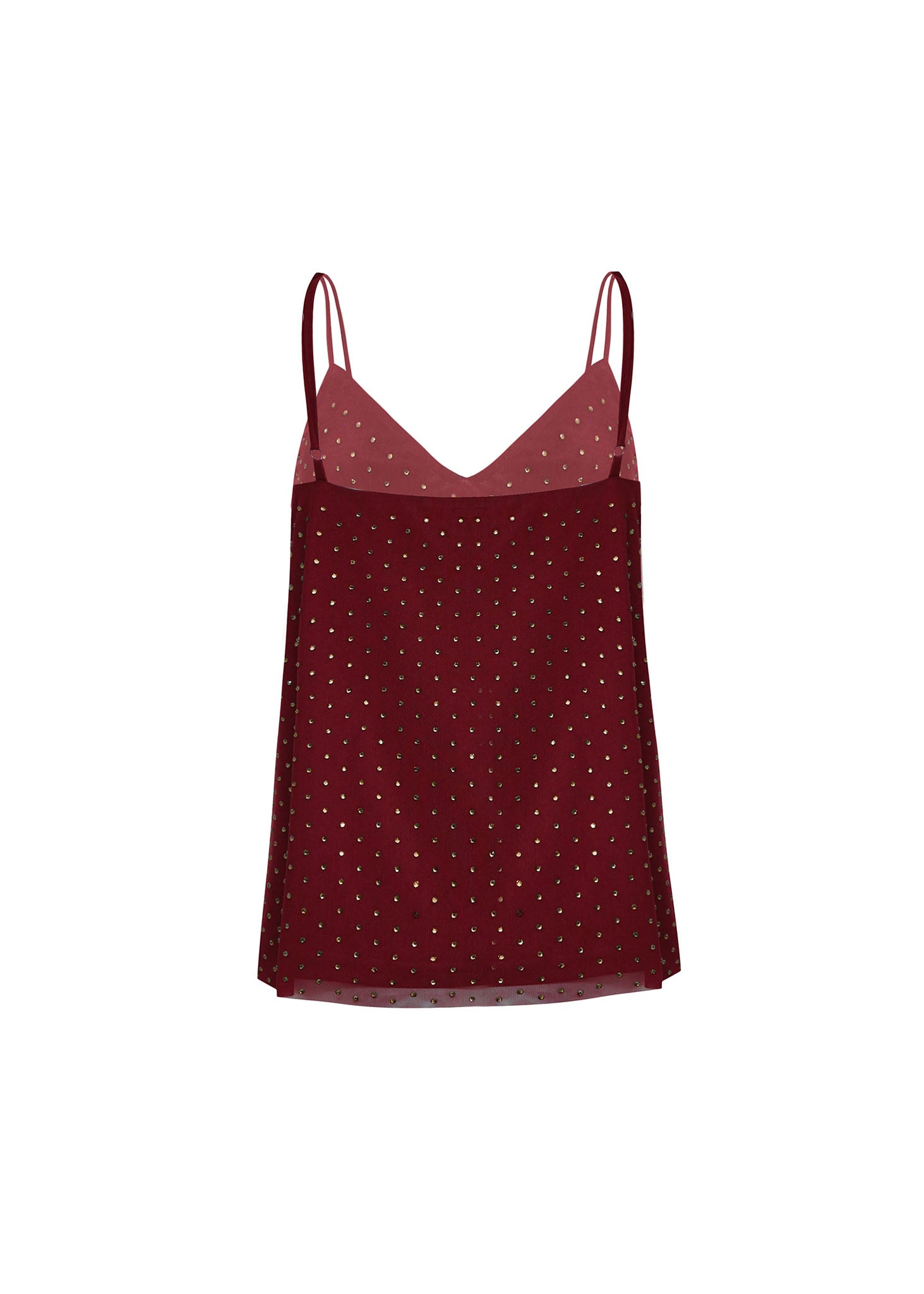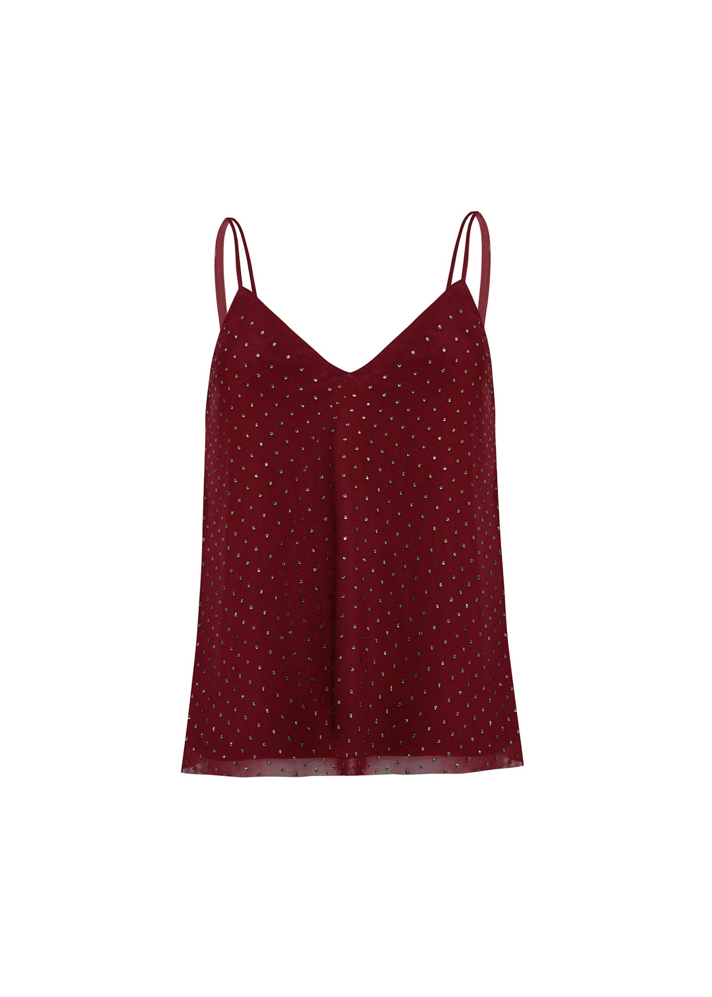 Añade un toque de brillo sutil a tus outfits con este Top de Tirantes Lencero. Confeccionado en un tejido ligero y semitransparente color vino o borgoña, está adornado con un delicado patrón de mini lunares metálicos dorados. El escote en V y los tirantes dobles finos lo hacen perfecto para looks de fiesta, noches especiales o como una elegante pieza de capas.