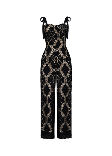 enterizo negro con fondo beige es una pieza de sofisticación y elegancia. Su diseño se caracteriza por un delicado encaje en malla tipo bordado con flores negras que cubre toda la prenda, creando un hermoso contraste entre el fondo suave beige y los detalles florales en negro. La mezcla de texturas aporta profundidad y un aire romántico, mientras que la silueta favorecedora resalta la figura con un toque de feminidad