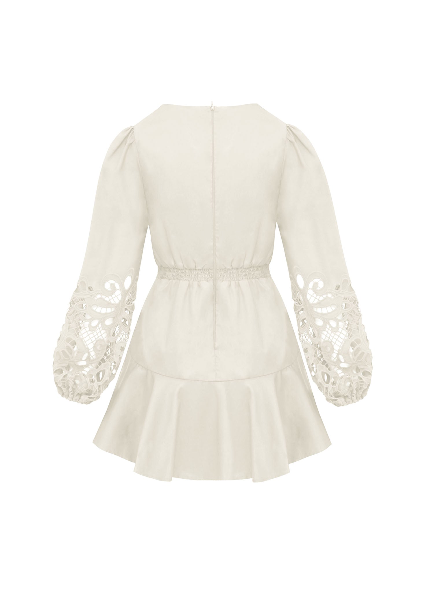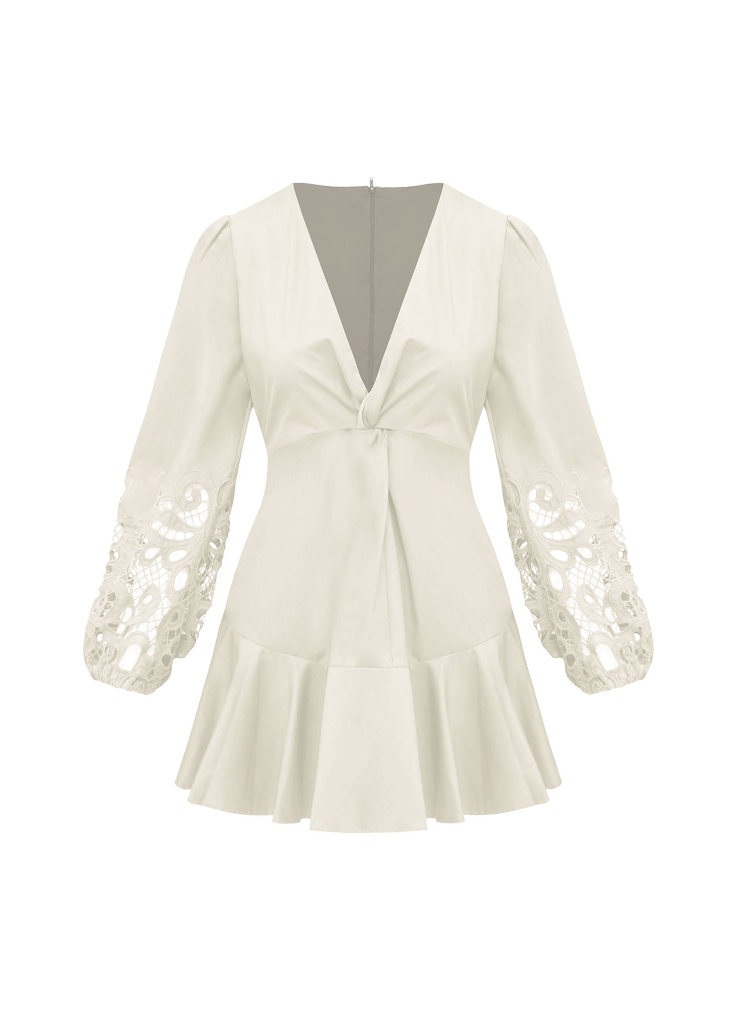 Vestido corto verde de mangas largas con un escote profundo en V que aporta un toque sensual y sofisticado. Las mangas cuentan con detalles en encaje, añadiendo un estilo único y natural al diseño. Perfecto para ocasiones donde se busque una mezcla de elegancia y originalidad.