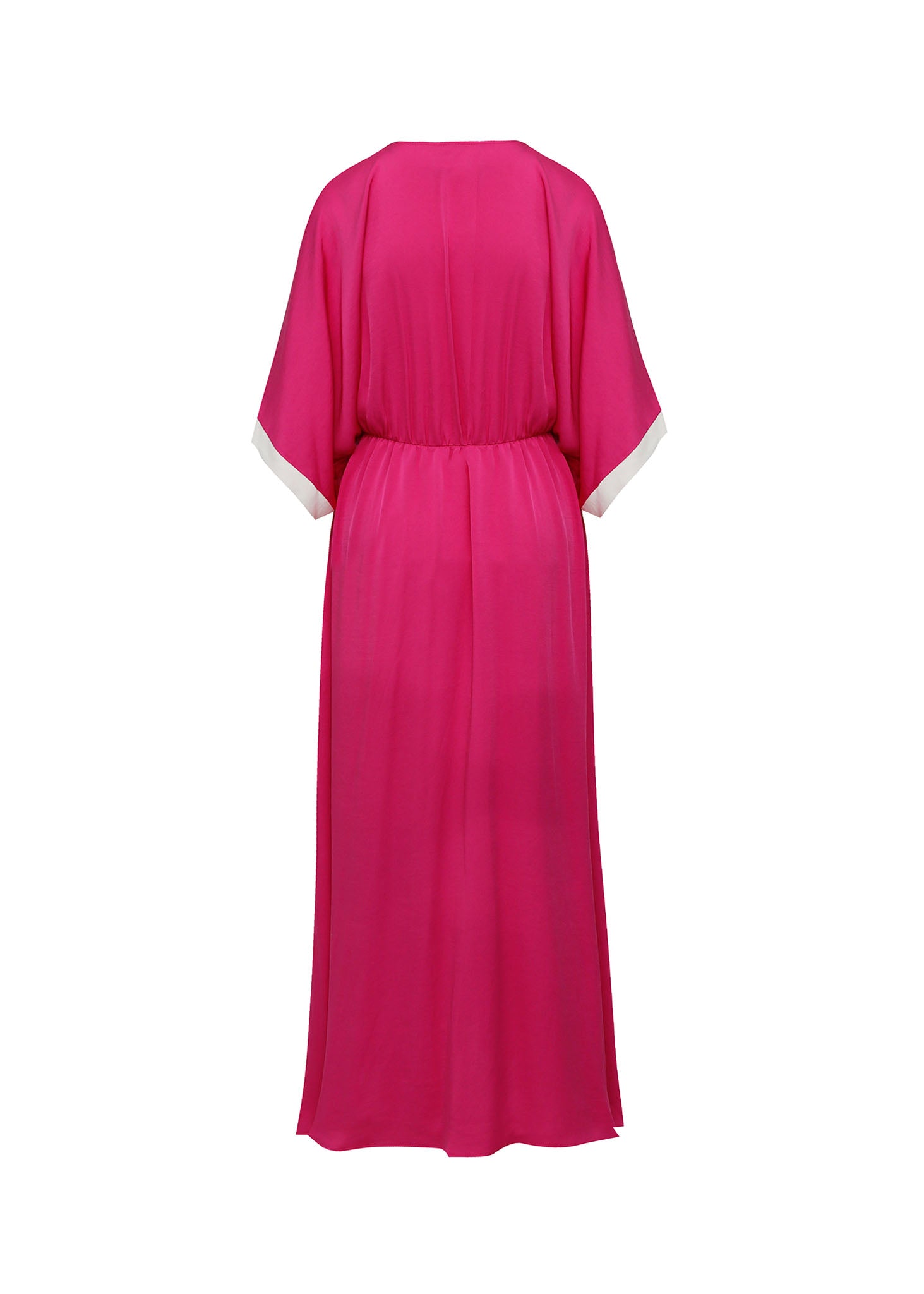 Este vestido largo de estilo caftán en un vibrante color fucsia es una pieza que desprende sofisticación y frescura a partes iguales. La prenda destaca por su profundo escote en "V" y sus mangas de corte kimono, ambos enmarcados por un contraste de vivos en color blanco que recorren longitudinalmente el centro y los puños, estilizando la figura y aportando un aire náutico moderno. Presenta un sutil fruncido bajo el pecho que define la silueta de manera cómoda, permitiendo que el tejido fluya con elegancia hasta los pies. Es el vestido ideal para un evento de verano o un look de playa sofisticado, gracias a su combinación de color audaz y líneas puras.