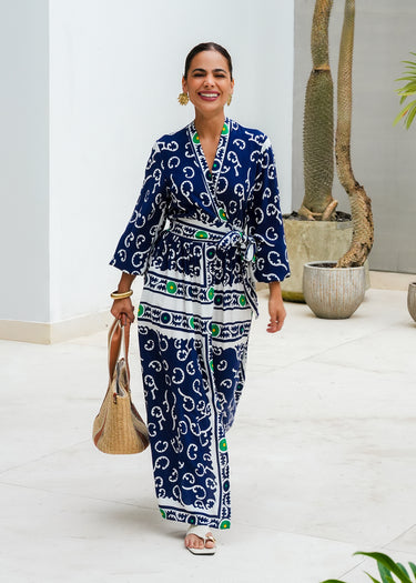La prenda está confeccionada en un tejido ligero de color azul marino profundo, decorado con un estampado ornamental de inspiración étnica en blanco óptico y detalles en verde esmeralda y amarillo mostaza. El diseño presenta un escote en "V" profundo que se ajusta a la cintura mediante una lazada ancha tipo faja, la cual permite entallar la figura y crea un volumen acampanado en la falda. Las mangas son de largo tres cuartos y cuentan con un puño elástico fruncido que añade una dimensión táctil y estructural. Los paneles del estampado están dispuestos estratégicamente para enmarcar el torso y el bajo, logrando una pieza de lujo bohemio ideal para eventos de verano o estilismos de viaje refinados.
