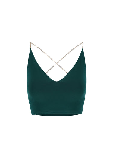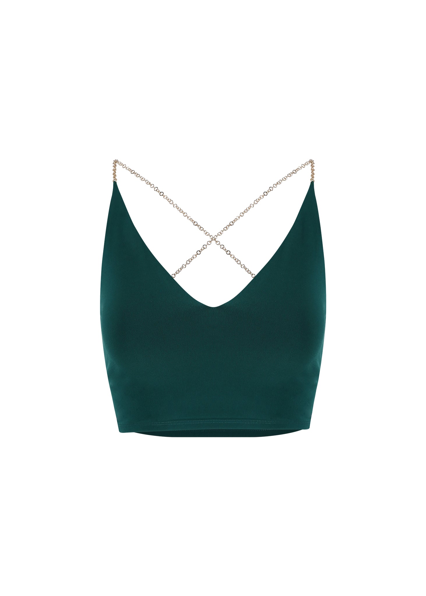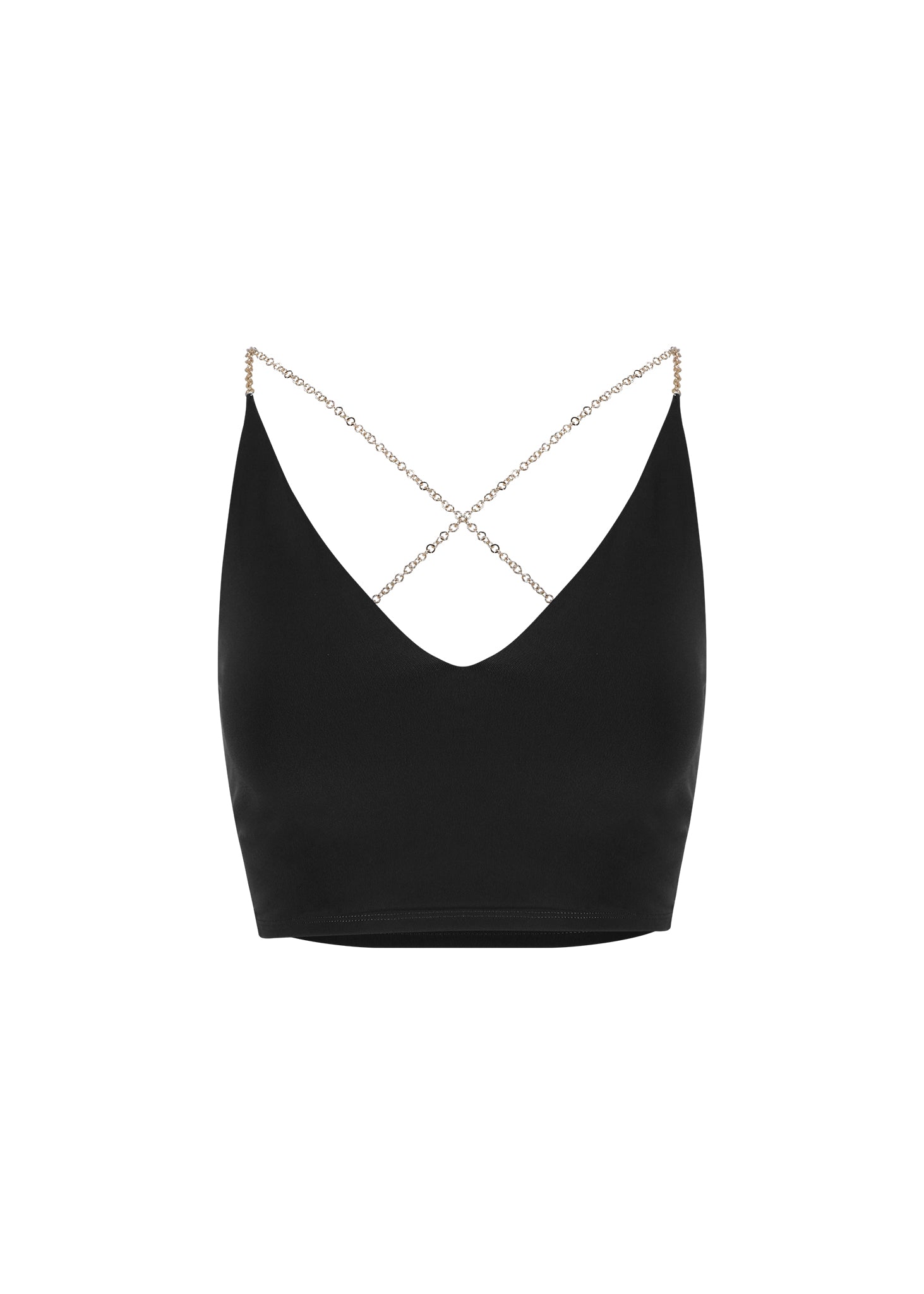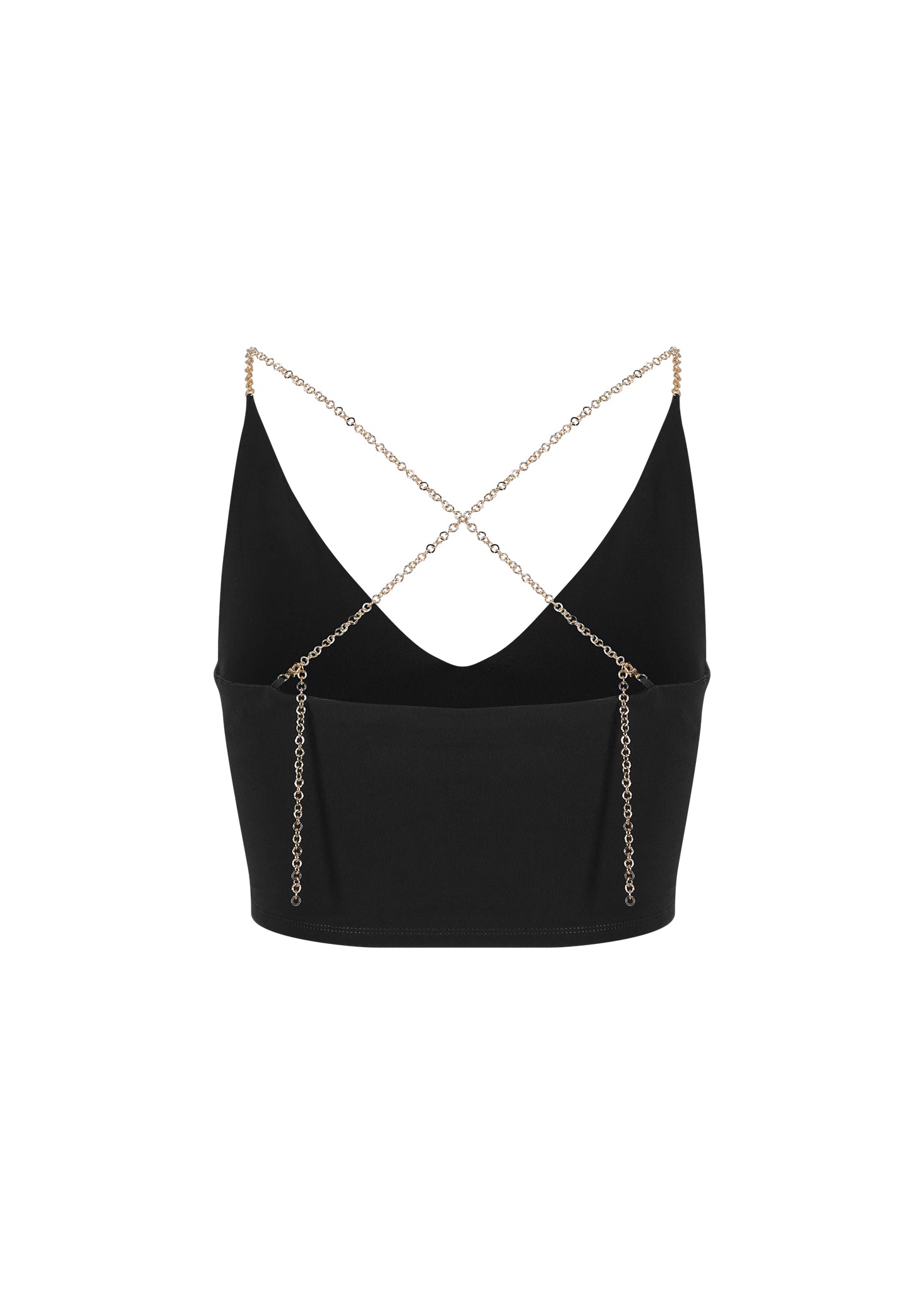 Este top bralette es la pieza esencial para un look de noche sensual y moderno. Confeccionado en un tejido negro ajustado y cómodo, presenta un favorecedor escote en V profundo. El diseño se distingue por sus finas tiras de cadena metálica que se cruzan elegantemente en la espalda, añadiendo un toque de brillo y sofisticación. Úsalo solo con pantalones de tiro alto o bajo un blazer abierto.