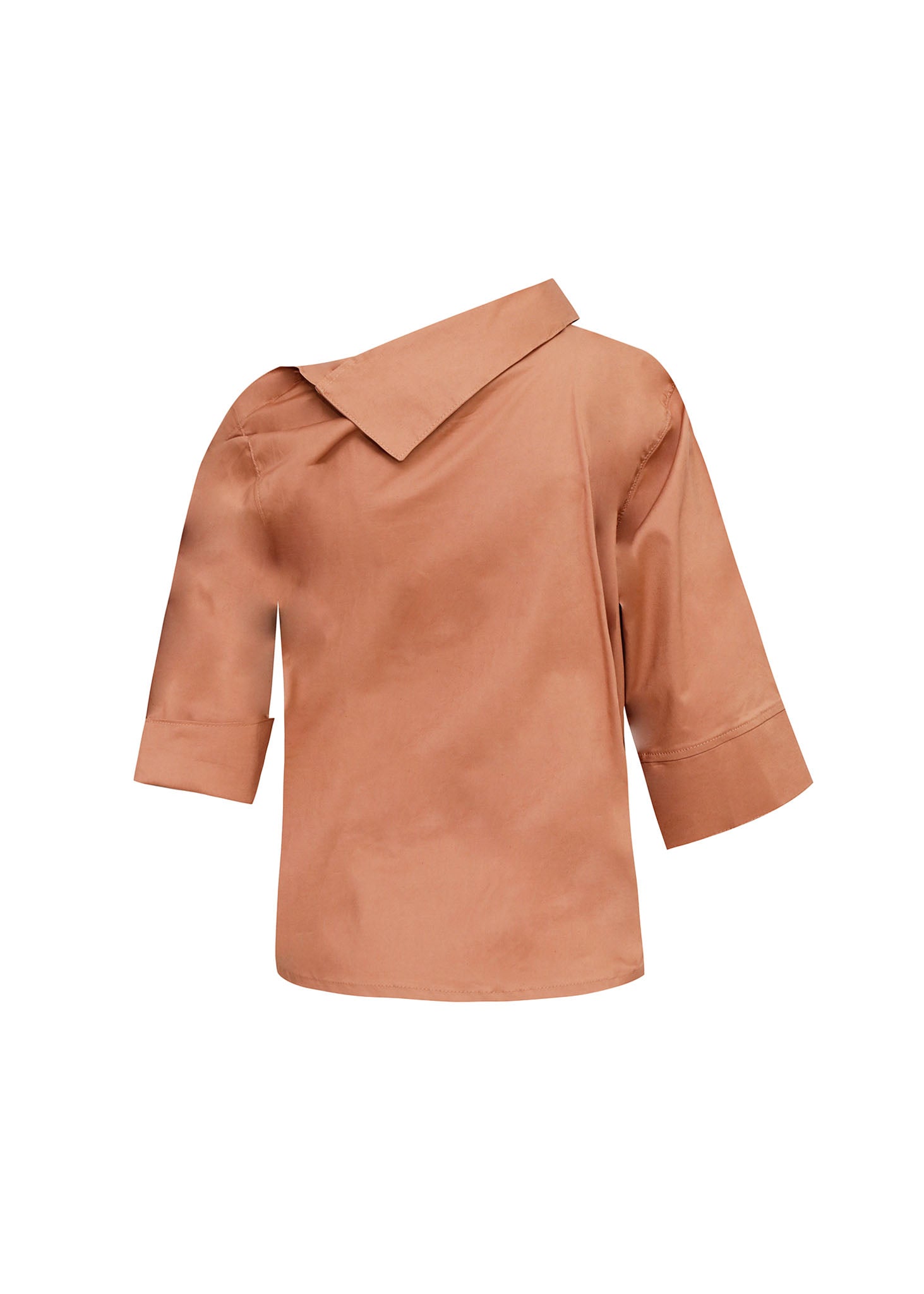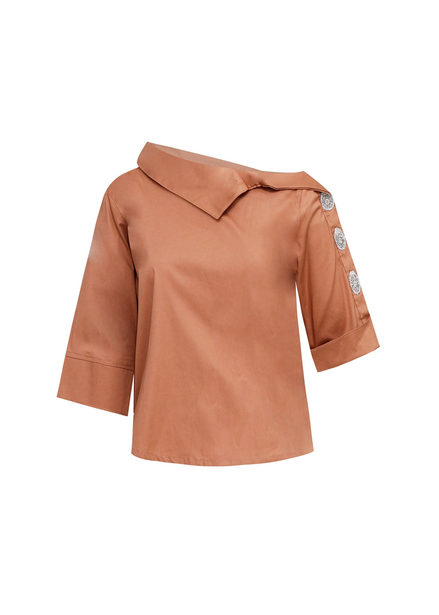 Este es un top de silueta ajustada y diseño asimétrico de un solo hombro (one-shoulder). Está confeccionado en un tejido con cuerpo en un sofisticado tono café (mocha o tierra). El diseño se centra en un aplique de pedrería o strass brillante estratégicamente ubicado, que inyecta un foco de luz statement. Esta pieza fusiona la tendencia minimalista del corte con el lujo glam del detalle.